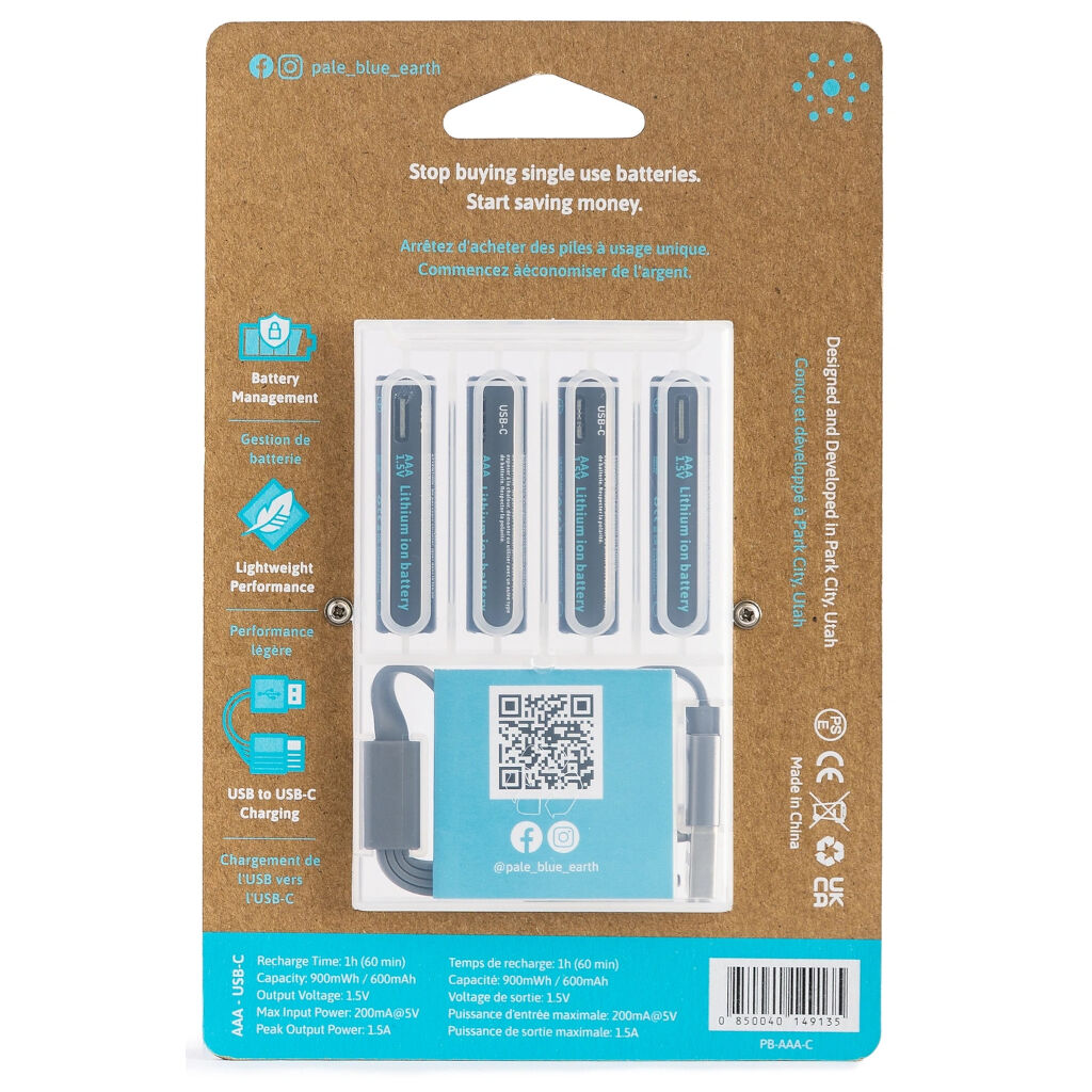 Wiederaufladbare Batterien, die über einen USB-C-Anschluss geladen werden, was das Aufladen zu Hause, im Auto oder über eine Powerbank erleichtert. Gerade für Camping ist Pale Blue Lithium USB-C wiederaufladbare AAA-Batterien eine sicherere Wahl, da man oft ein USB-C-Ladegerät für das Telefon oder Tablet dabei hat. Sie kommen auch in einer Hülle mit einem Ladekabel mit vier Ausgängen, sodass Sie vier Batterien gleichzeitig laden können.