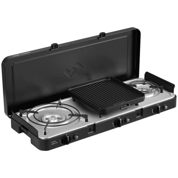 Bereiten Sie im Urlaub eine Vielzahl von Mahlzeiten mit dem 3 Cook Turbo FFD zu. Dieser Kocher mit drei Brennern ist mit einer flachen und einer geriffelten Grillplatte, einem Topfträger und einem Windschutz ausgestattet. Beide Grillplatten verfügen über einen abnehmbaren Griff und sind mit einer keramischen GreenGrill-Beschichtung für gesünderes Kochen versehen.