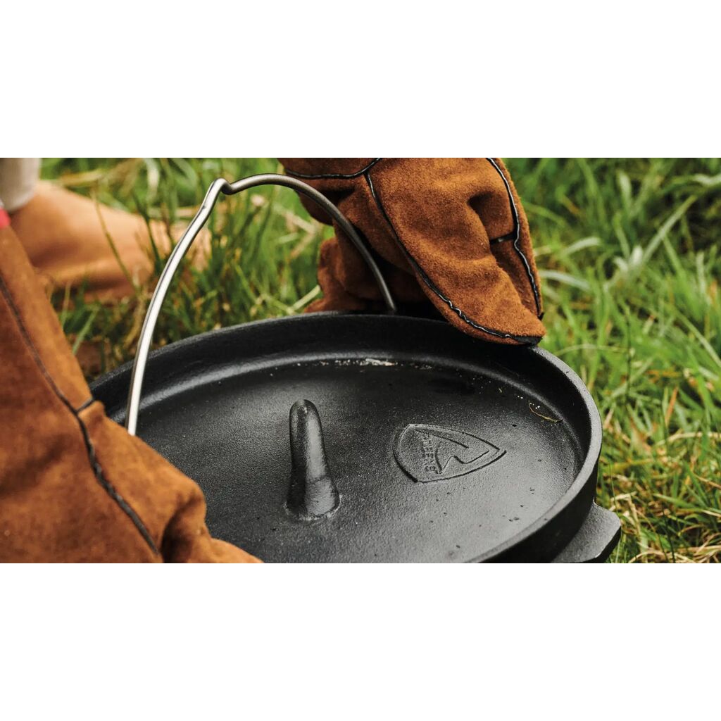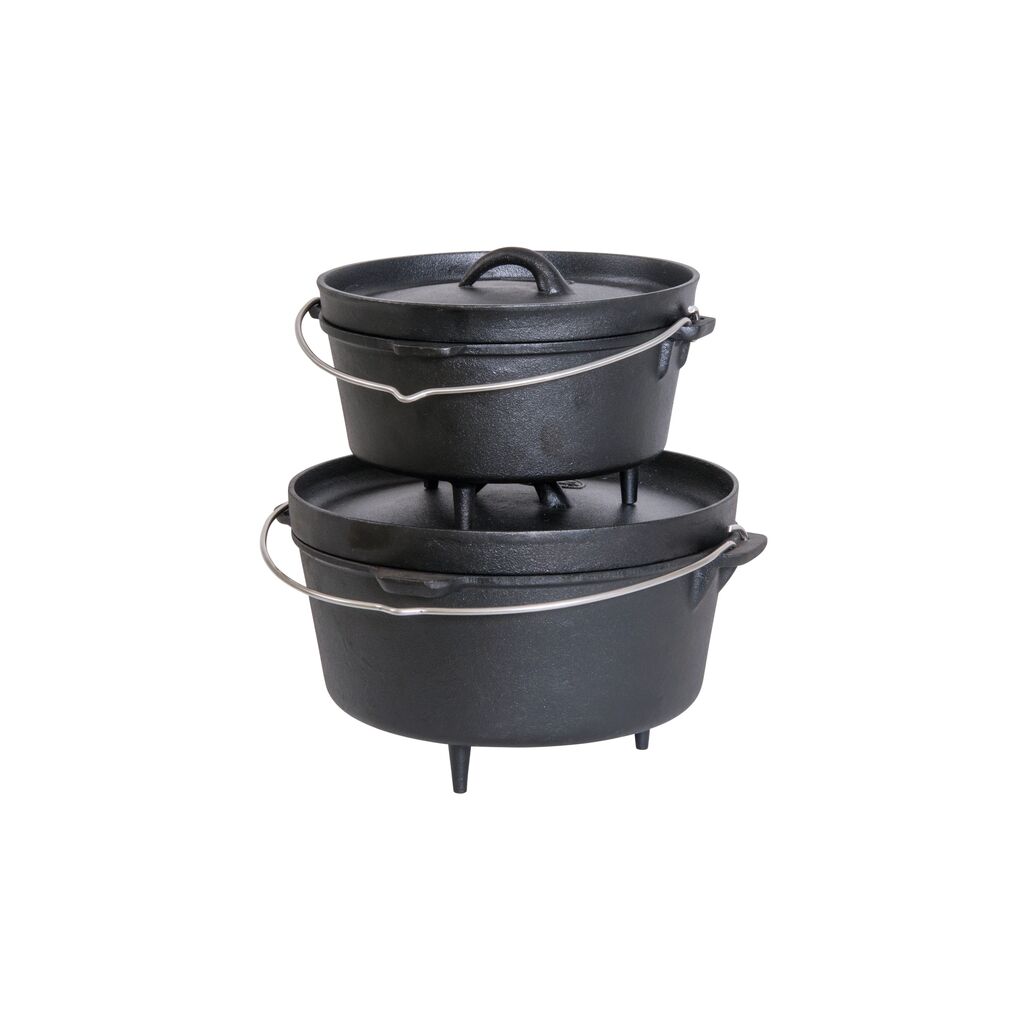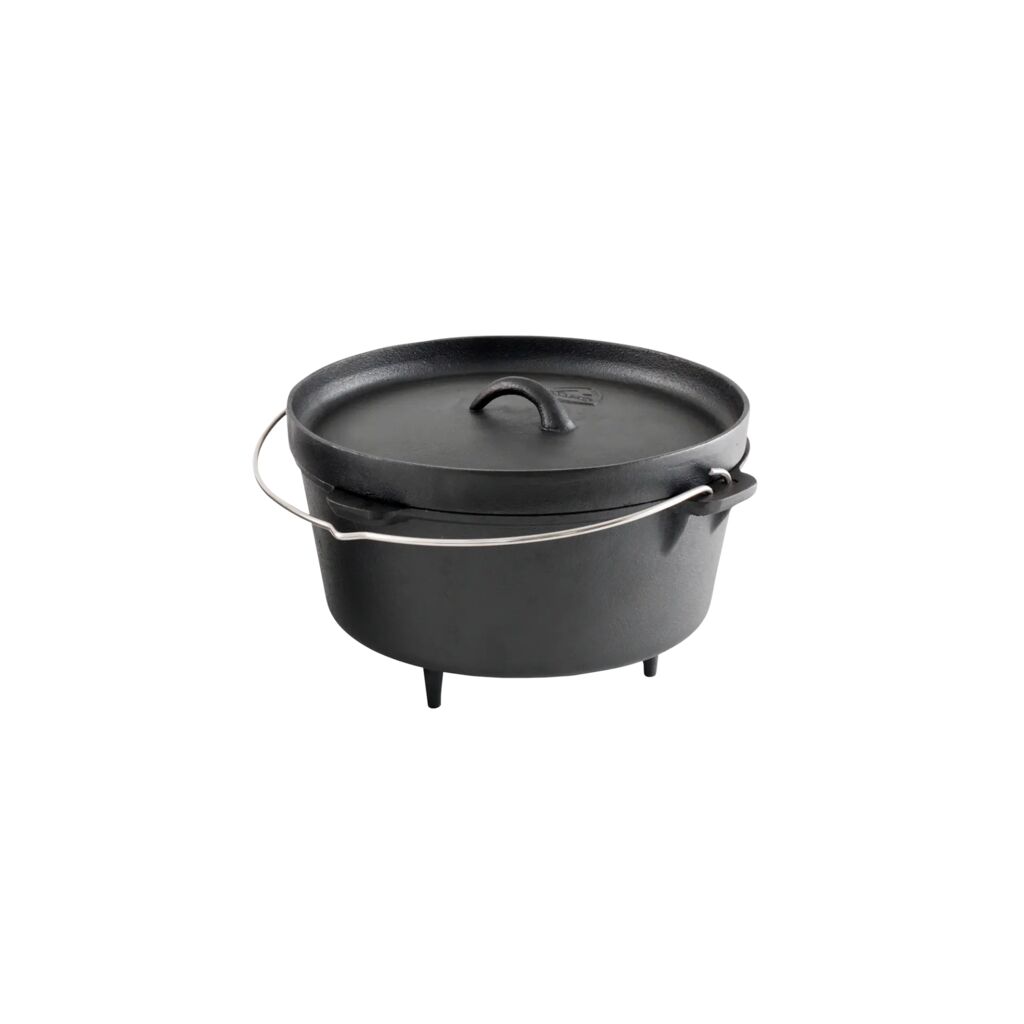 Topf, der auch als Ofen für sowohl Kochen als auch Backen verwendet werden kann. Verwenden Sie ihn über dem Feuer, im Ofen oder mit einem stärkeren Gasbrenner. Hergestellt aus Gusseisen, um die Wärmeübertragung und Wärmeverteilung zu optimieren. Der Topf ist vorbehandelt, sodass er direkt aus der Verpackung verwendet werden kann.