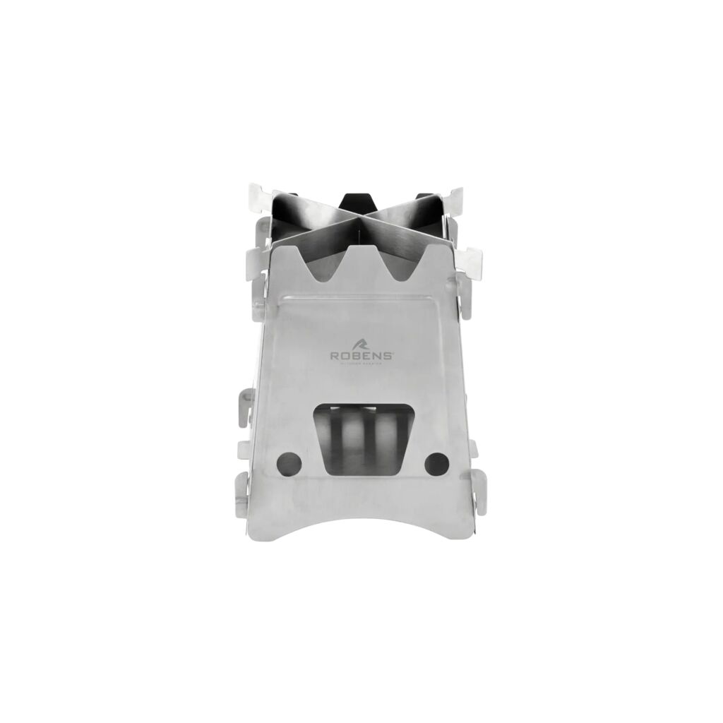 Outdoor-Kocher für Holz, Zweige oder andere brennbare Materialien aus der Natur. Der Brennstoff kann während des Kochens von der Seite nachgelegt werden. Der Kocher kann auch mit einem Spiritusbrenner oder Brennstofftabletten verwendet werden. Wenn er nicht benutzt wird, lässt er sich zu einem flachen Paket zusammenklappen, das sehr wenig Platz im Gepäck einnimmt.