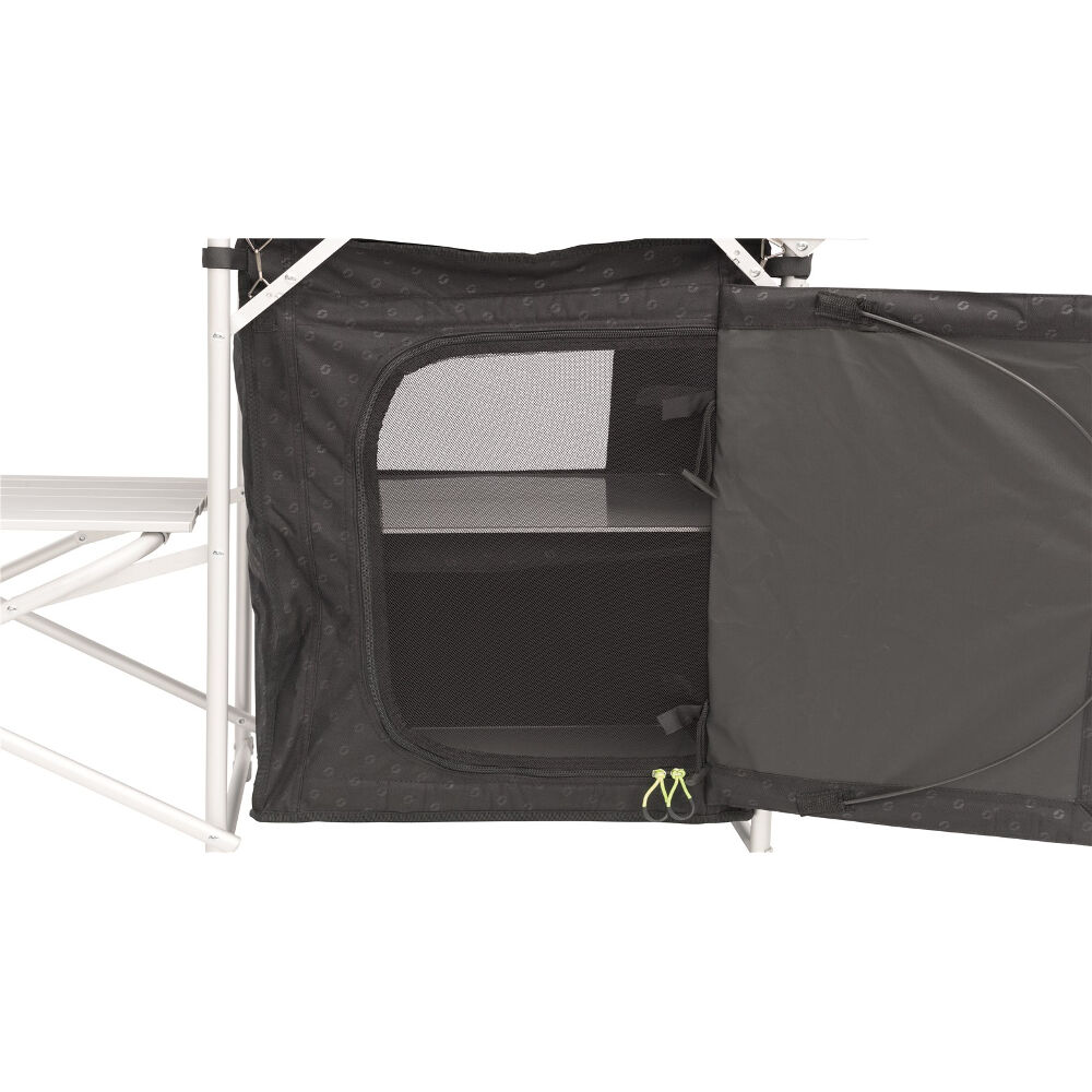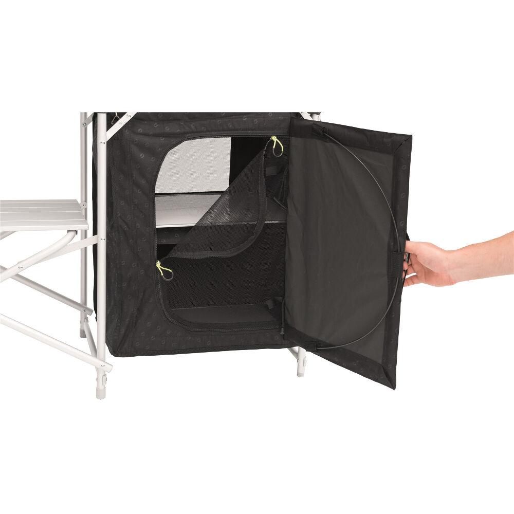 Zwei Schränke mit zwei festen Regalen sowie ein Regal unter dem Kocher bieten Camrose auch viel Platz für die Aufbewahrung von Lebensmitteln, Ausrüstung und der Gasflasche. Die Öffnungen der Schränke können in geöffneter Position fixiert oder wie ein gewöhnlicher Küchenschrank geschlossen werden, dank der Magnete, die sie in Position halten. Auf der Rückseite der Schränke befindet sich eine mit Insektennetz versehene Belüftungsöffnung, die Lebensmittel frisch hält. An den Seiten der Schränke befinden sich auch Aufbewahrungstaschen, die die Aufbewahrung und Zugänglichkeit von beispielsweise Küchenutensilien erleichtern.