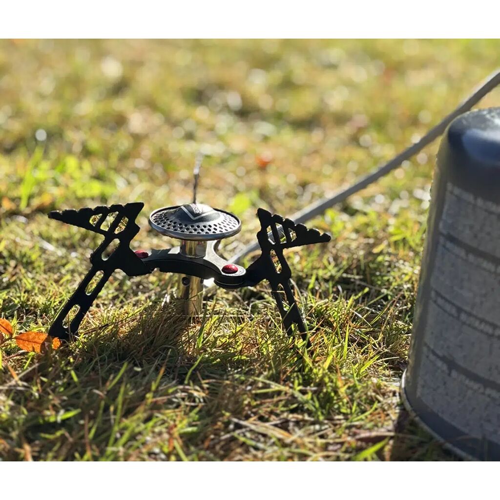 Leichter, stabiler Gaskocher mit freistehendem Brenner, der auch für größere Töpfe und Pfannen geeignet ist. Durch die verstellbaren Beine und den Kochgeschirrhalter ist er perfekt für unebenen Untergrund geeignet. Die große Scheibe verbessert die Leistung des Brenners.