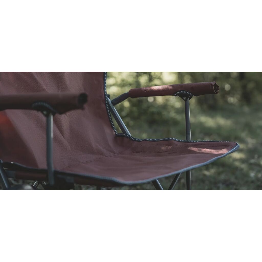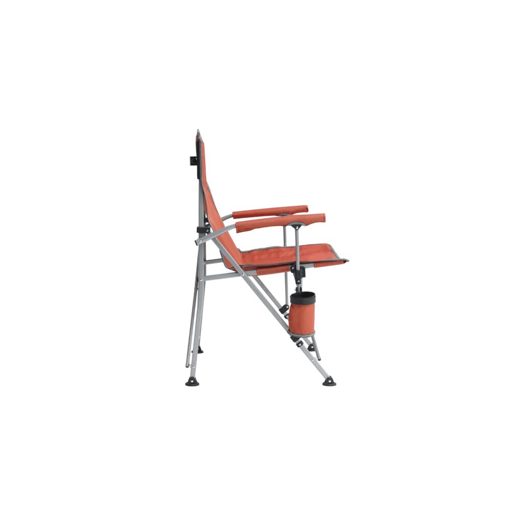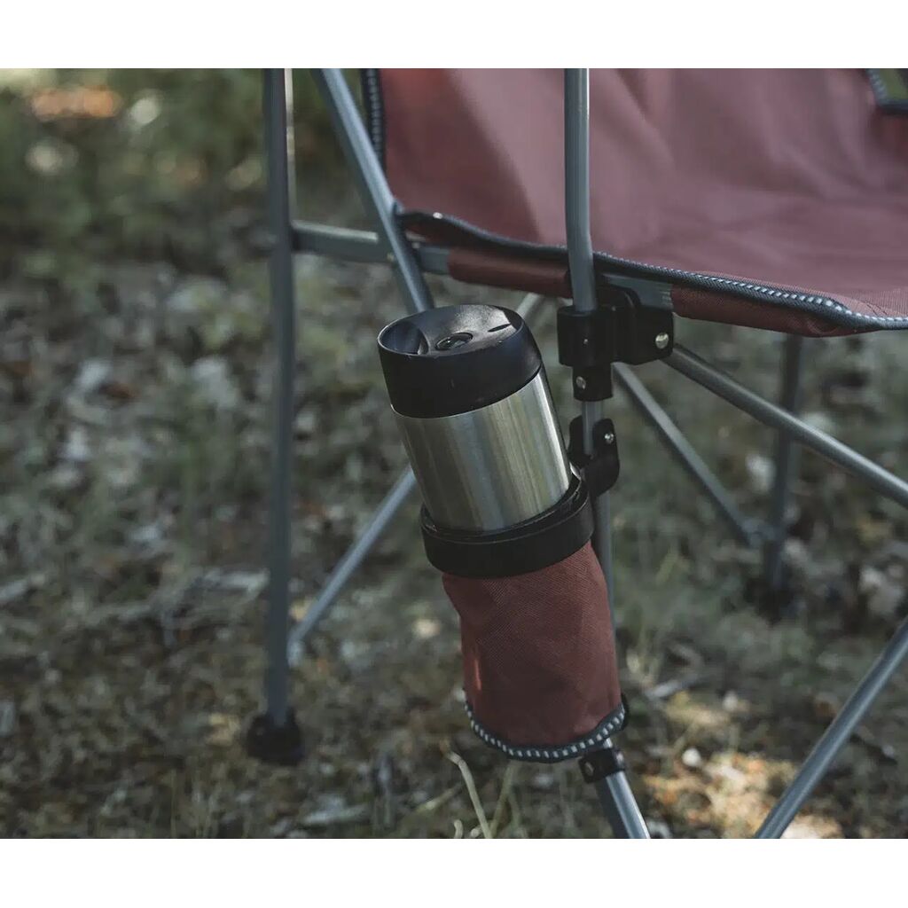 Packfreundlicher Campingstuhl mit robustem Stahlrahmen, gepolsterten Armlehnen und Getränkehalter. Belastbar bis 110 kg.