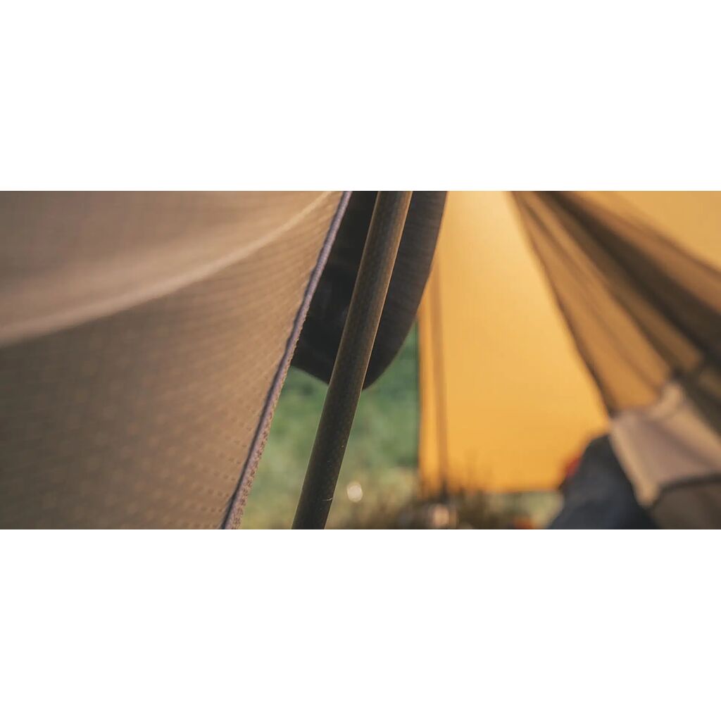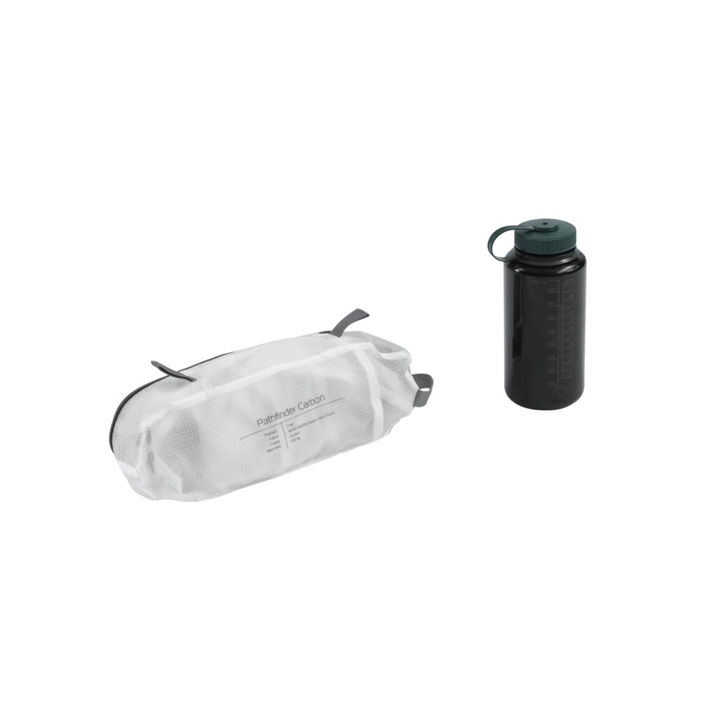 Sehr leichter und packfreundlicher Stuhl mit einem strapazierfähigen Kohlefaserrahmen. Aussparungen im Stoff verbessern die Atmungsaktivität und reduzieren das Gewicht.