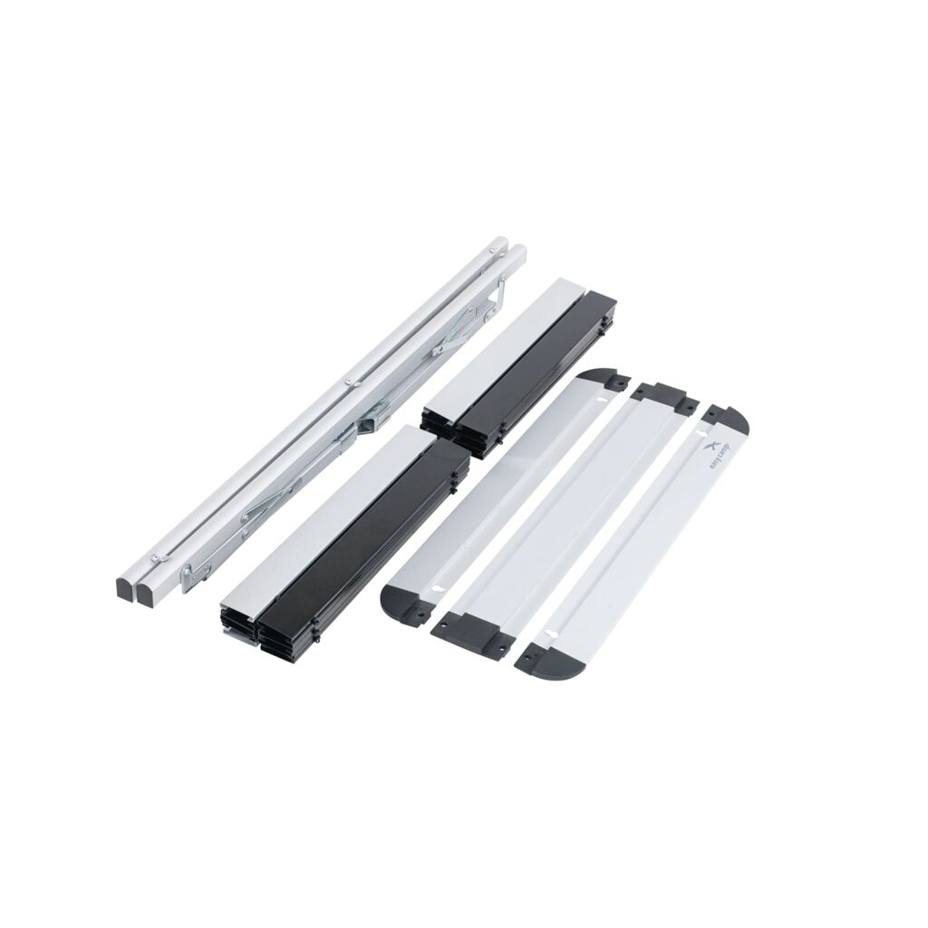 Klappbarer Tisch mit abnehmbarer Tischplatte aus Lamellen/Platten, die zusammengerollt werden können und dem Tisch ein sehr kleines Packmaß verleihen. Perfekt für das Zelten, wenn nur das Auto zum Packen zur Verfügung steht. Inklusive Tasche für Transport und Aufbewahrung.