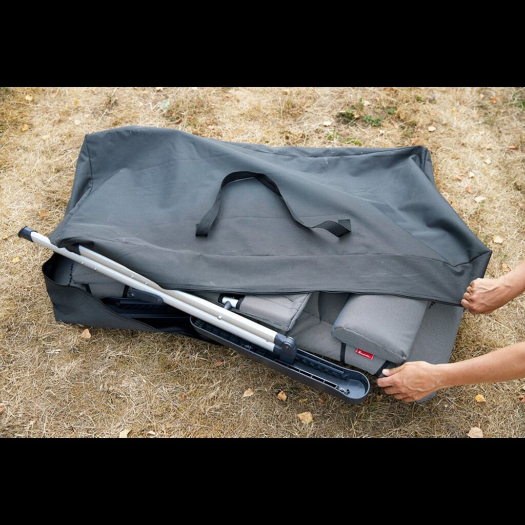 Geräumige Tasche, die für zwei Campingstühle geeignet ist. Perfekt für diejenigen, die ihre Campingstühle einfach und bequem transportieren oder lagern möchten. Mit einem Trennwand in der Mitte, der die Stühle davor schützt, aneinander zu kratzen, und einem doppelten Reißverschluss.