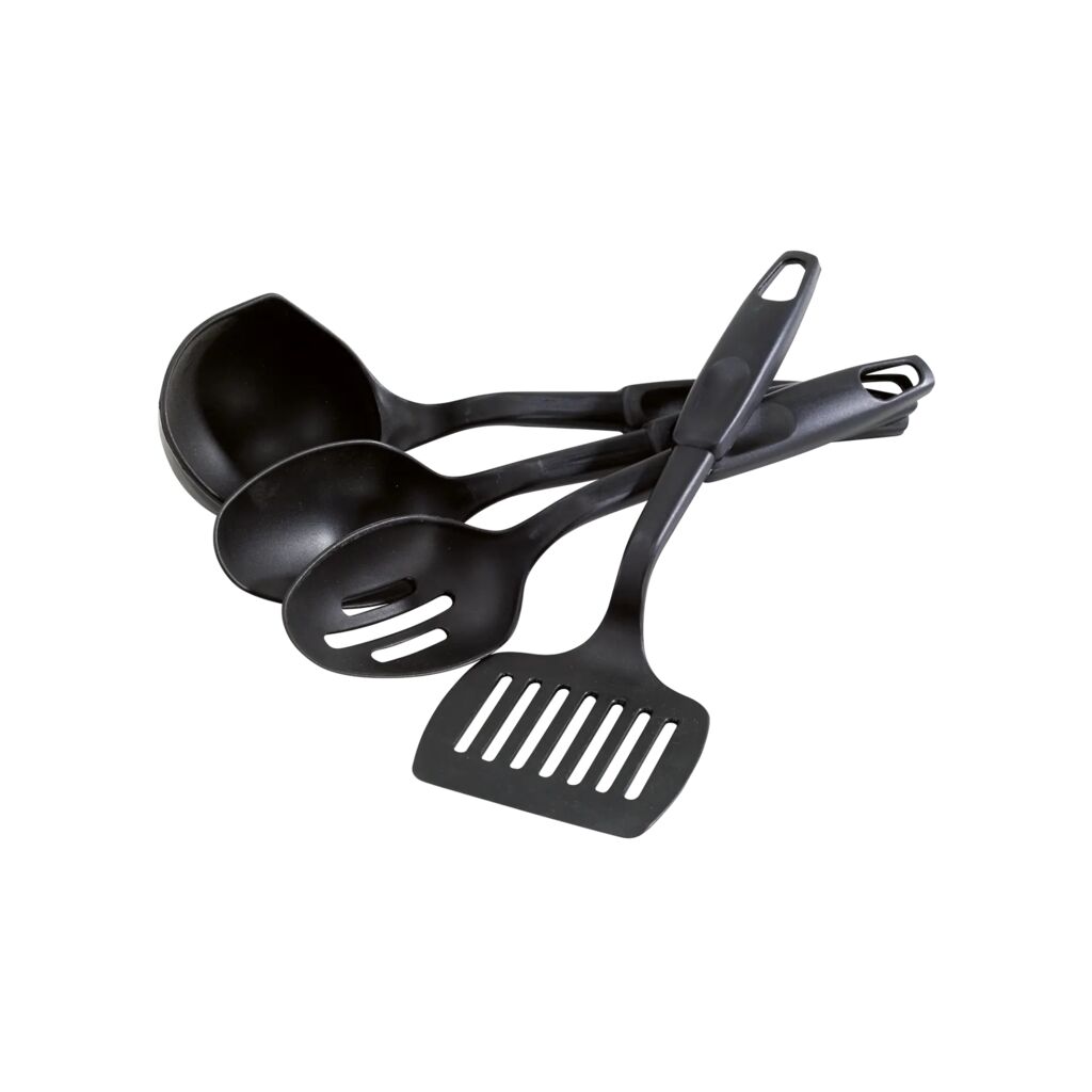 Küchenutensilien für Camping. Das Set enthält einen Pfannenwender, eine Schöpfkelle, einen Servierlöffel und eine Schaumkelle.