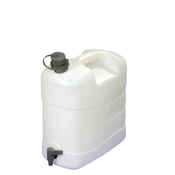 Praktischer Wasserbehälter mit 20 Litern, ein sogenannter Jerry Can, hergestellt in Deutschland von der Firma Comet. Bequemer Tragegriff, verstellbarer Zapfhahn und flexibler Ausguss. Große Öffnung erleichtert schnelles Befüllen/Entleeren.