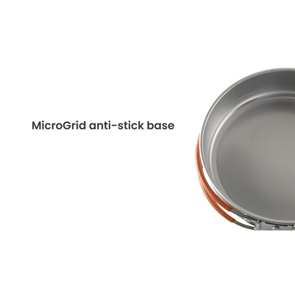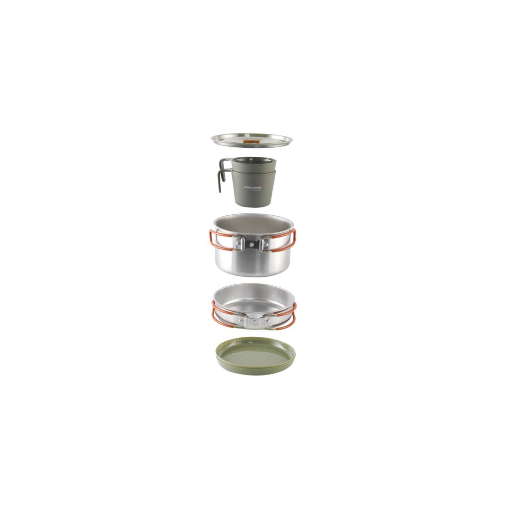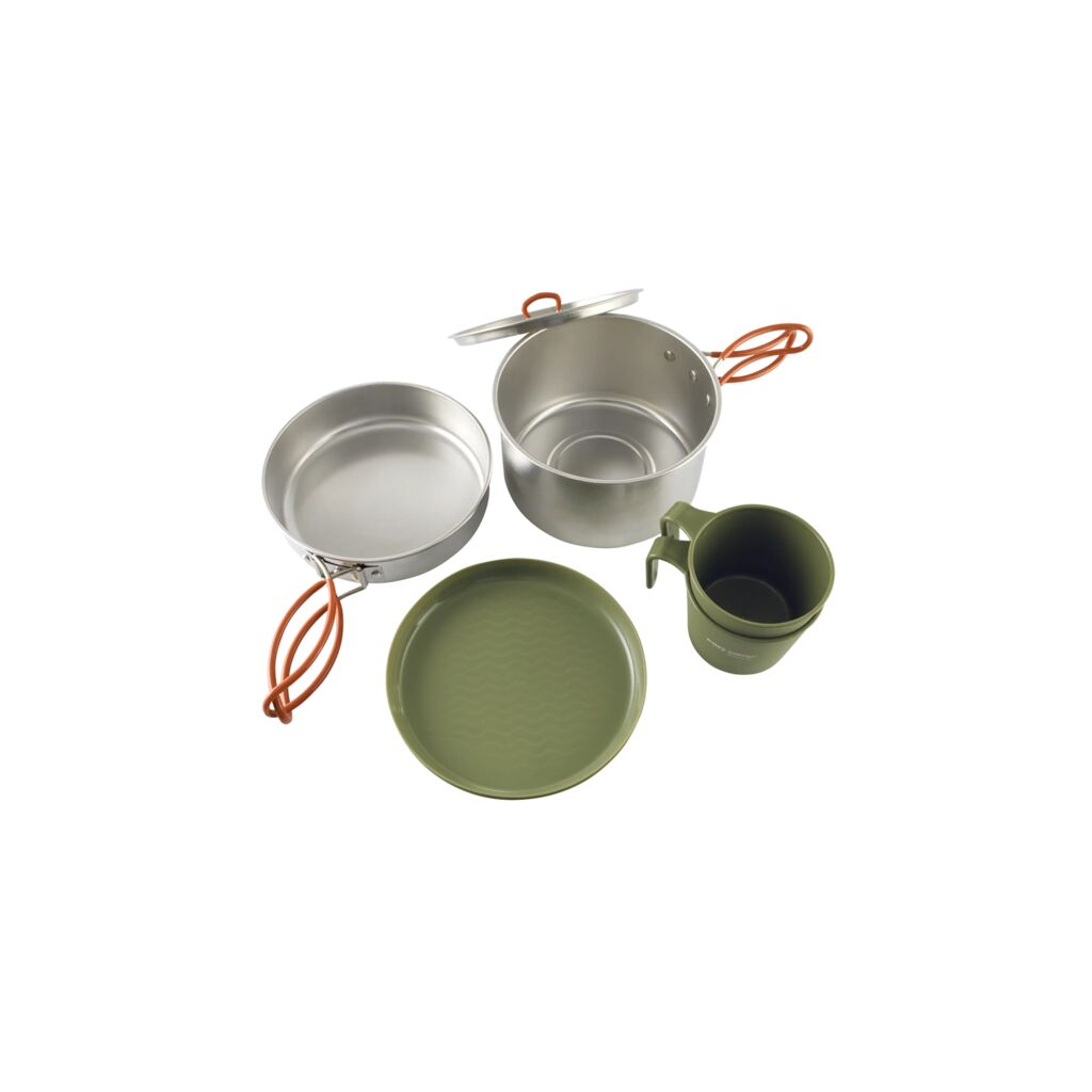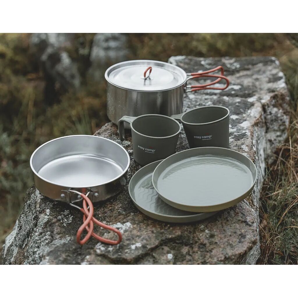 Set mit Bechern und Tellern für 2 Personen inklusive eines 2-Liter-Topfs und einer Bratpfanne. Das Set ist stapelbar und wird mit einem Netzbeutel zur Aufbewahrung geliefert.