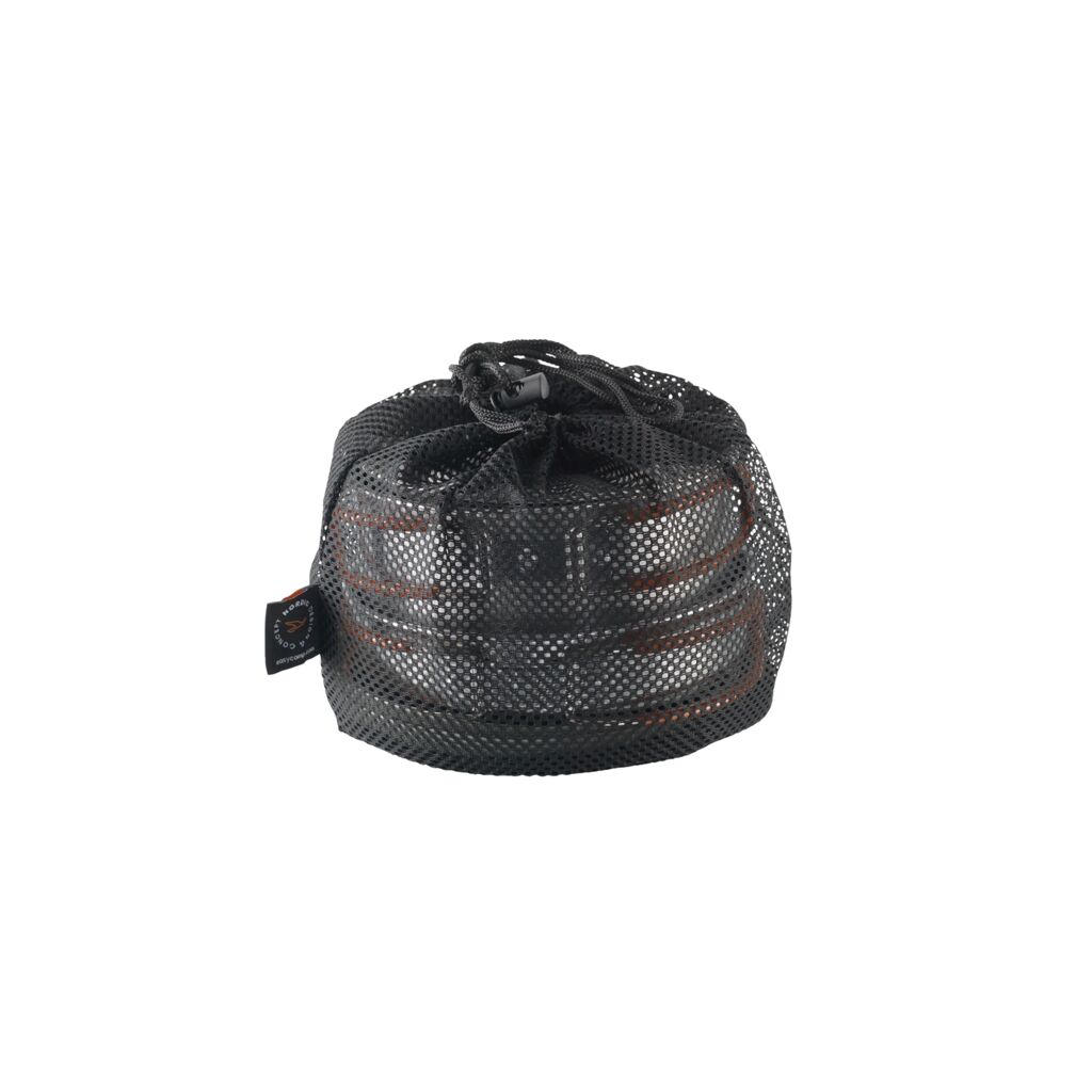 Set with mugs and plates for 2 people, including a 2-litre pot with lid and a frying pan. The set is stackable and comes with a mesh bag for storage.