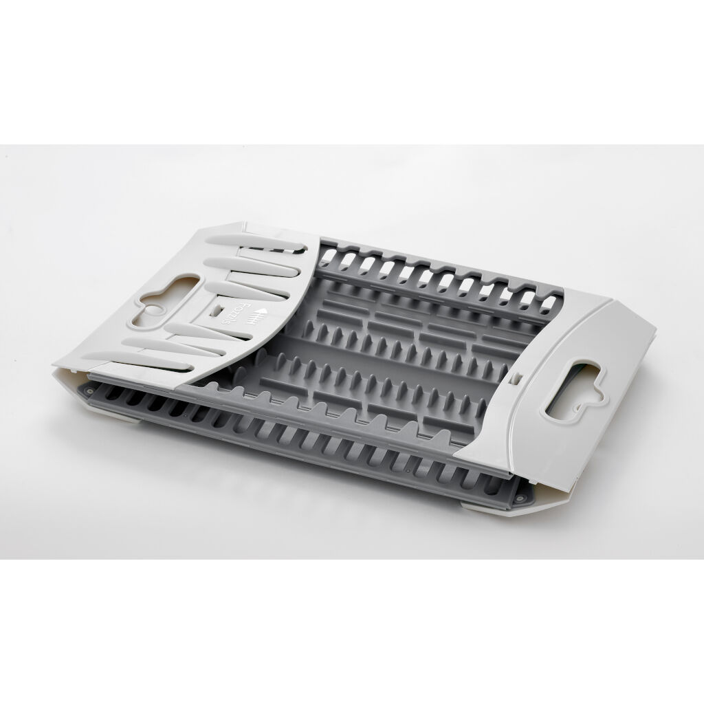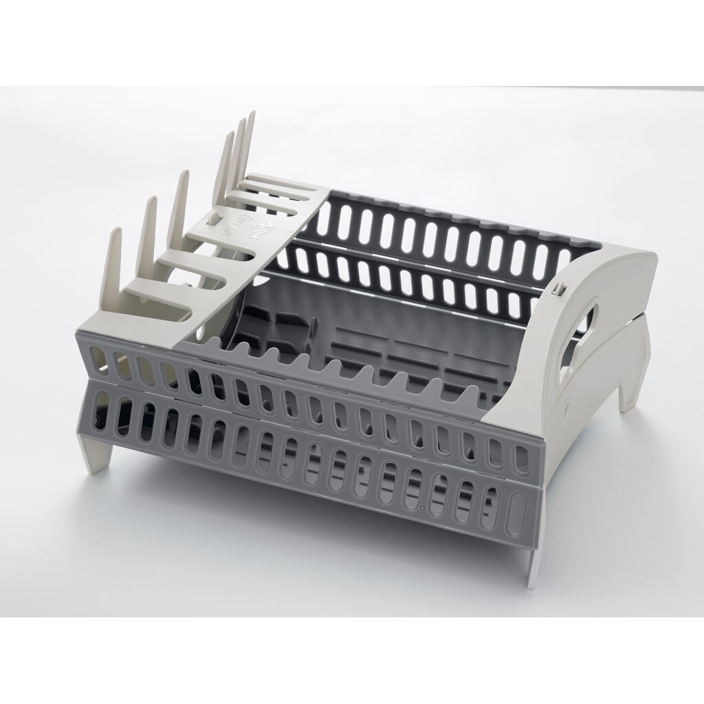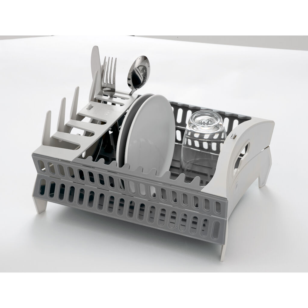 Faltbares Abtropfgestell von Isabella mit Tellerhaltern und Platz für mehrere Besteckteile. Lässt sich leicht zu einem kompakten Packmaß zusammenklappen.