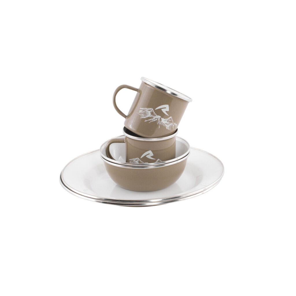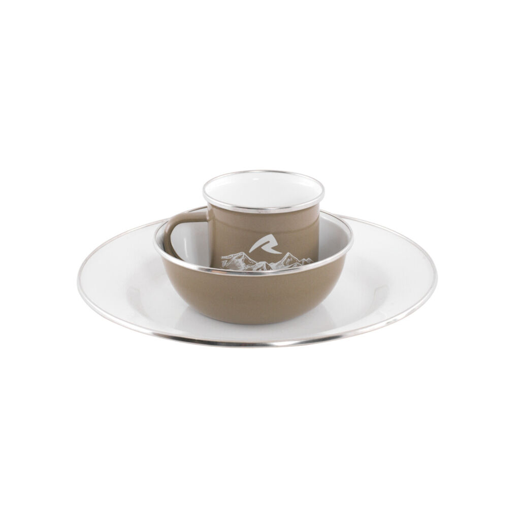 Essgeschirr aus emailliertem Stahl für eine Person. Emaillierter Stahl bietet eine überlegene Haltbarkeit. Alle Teile sind spülmaschinenfest.