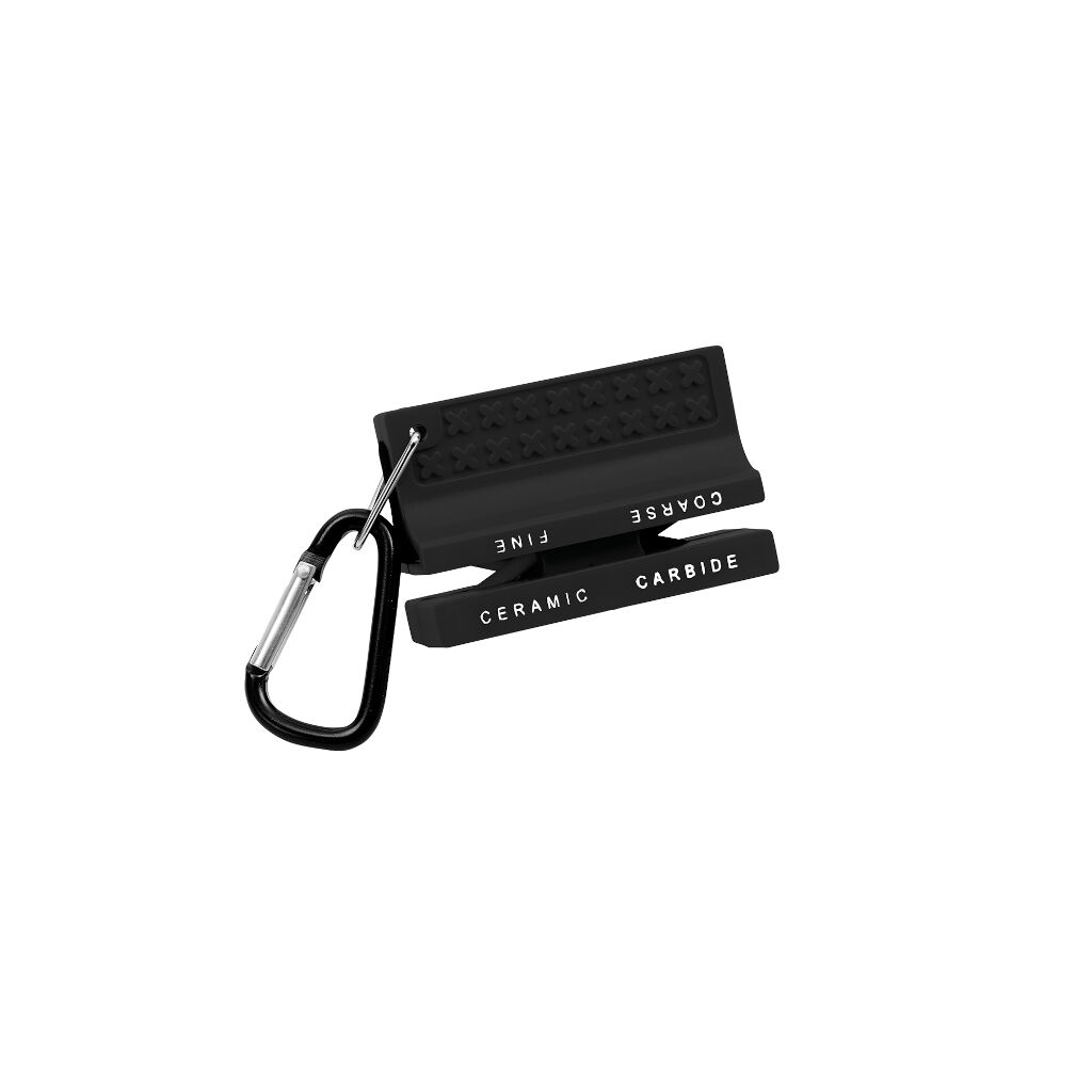Messerschärfer mit grober und feiner Schleife. Lässt sich einfach mit dem mitgelieferten Karabinerhaken befestigen. Der Schärfer kann sowohl Messer als auch Scheren in Sekunden schärfen.
