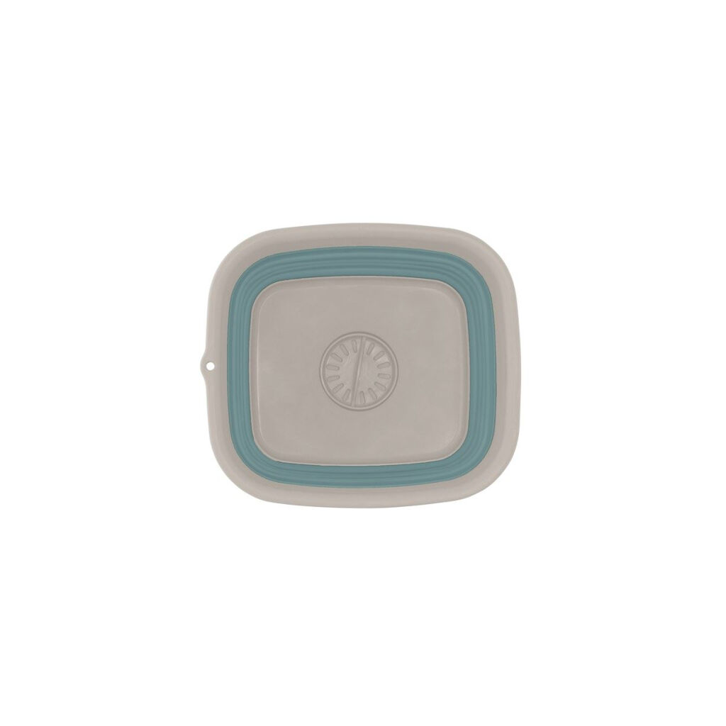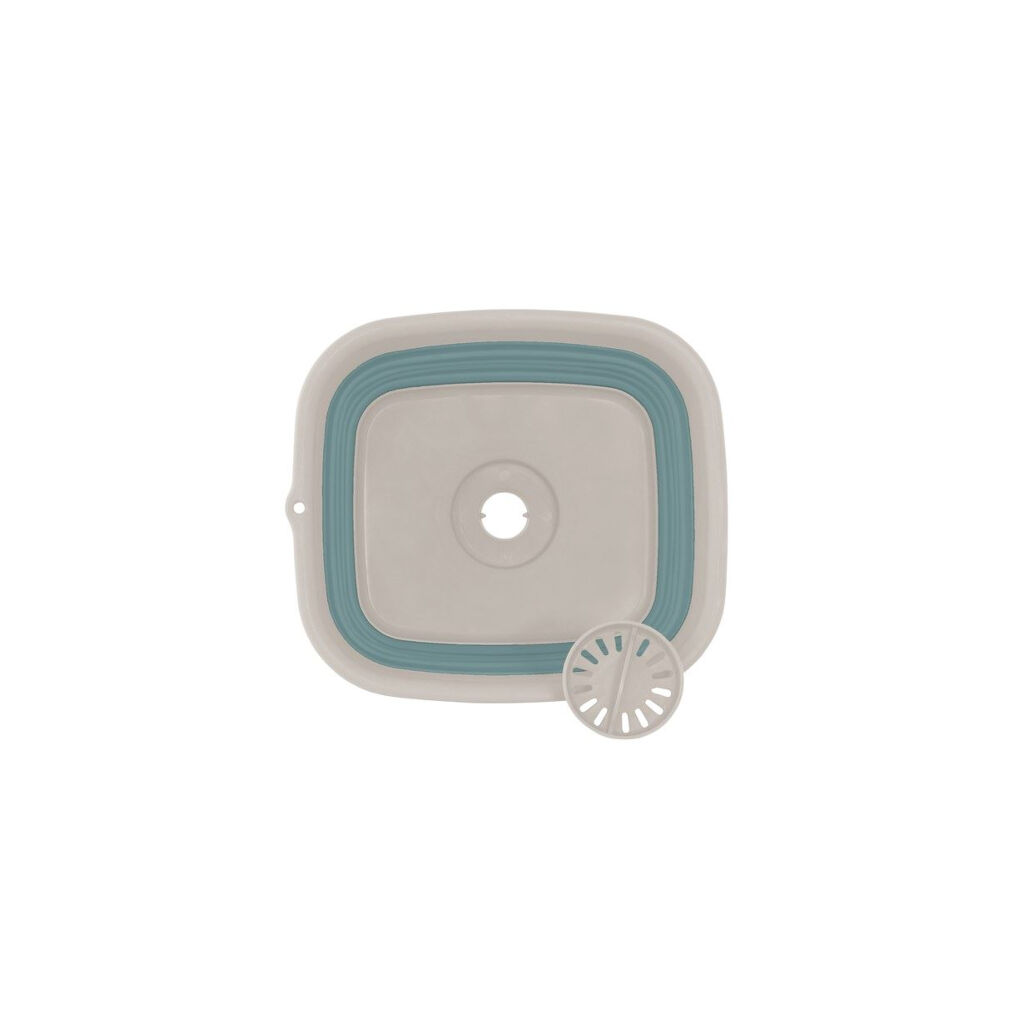 Intelligente faltbare Spüle mit eingebautem Abfluss und Stöpsel. Wenn sie nicht verwendet wird, wird sie auf nur 7 cm Höhe zusammengeklappt, was sie leicht mit auf den Campingausflug zu nehmen macht.