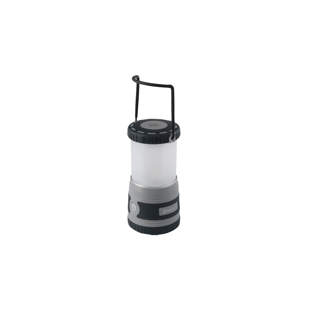 Helle Campinglampe mit Tragegriff. Dank eines Hakens an der Unterseite und der abnehmbaren oberen Abdeckung kann sie auch als Deckenleuchte im Zelt verwendet werden. Wird mit 3 AA-Batterien betrieben (nicht enthalten).