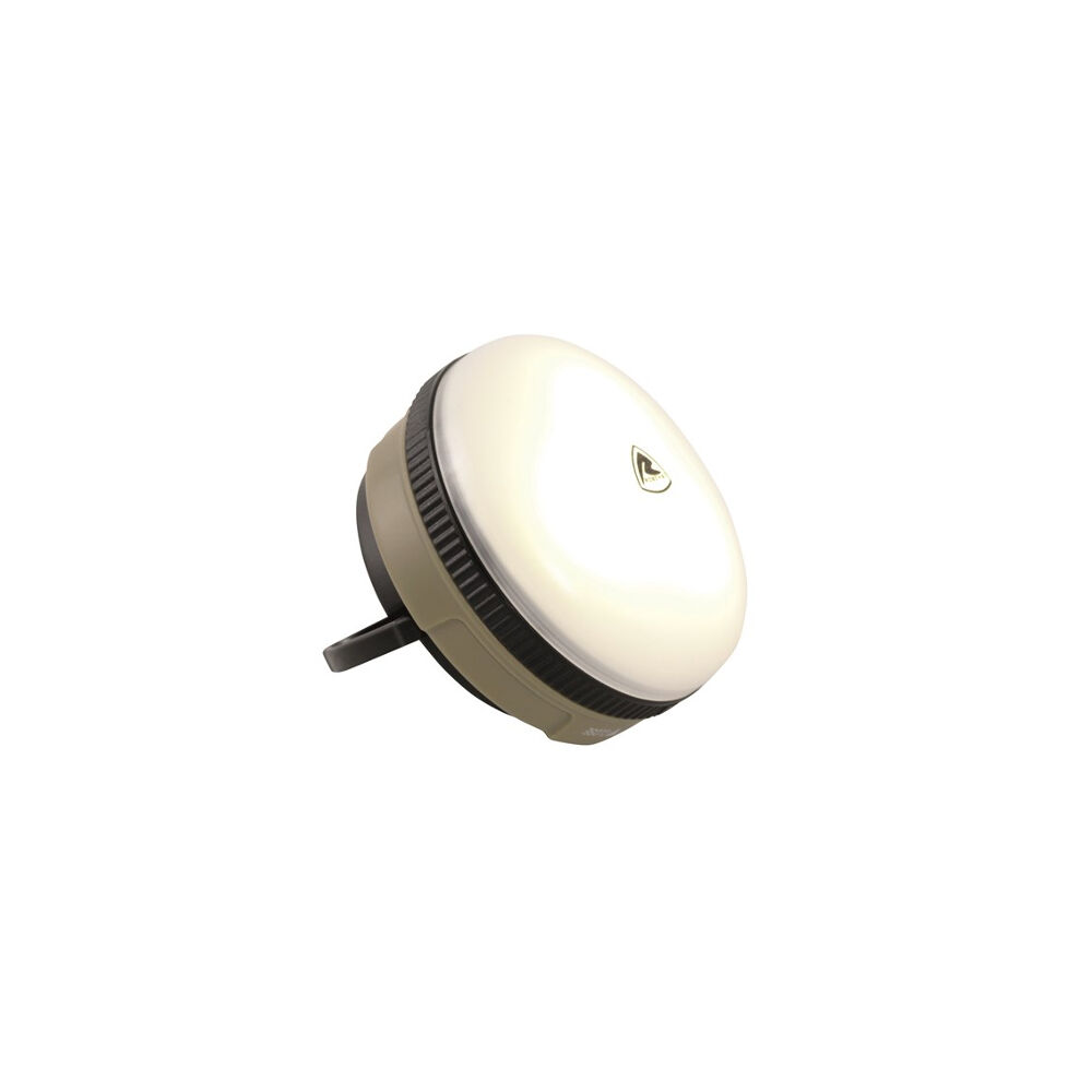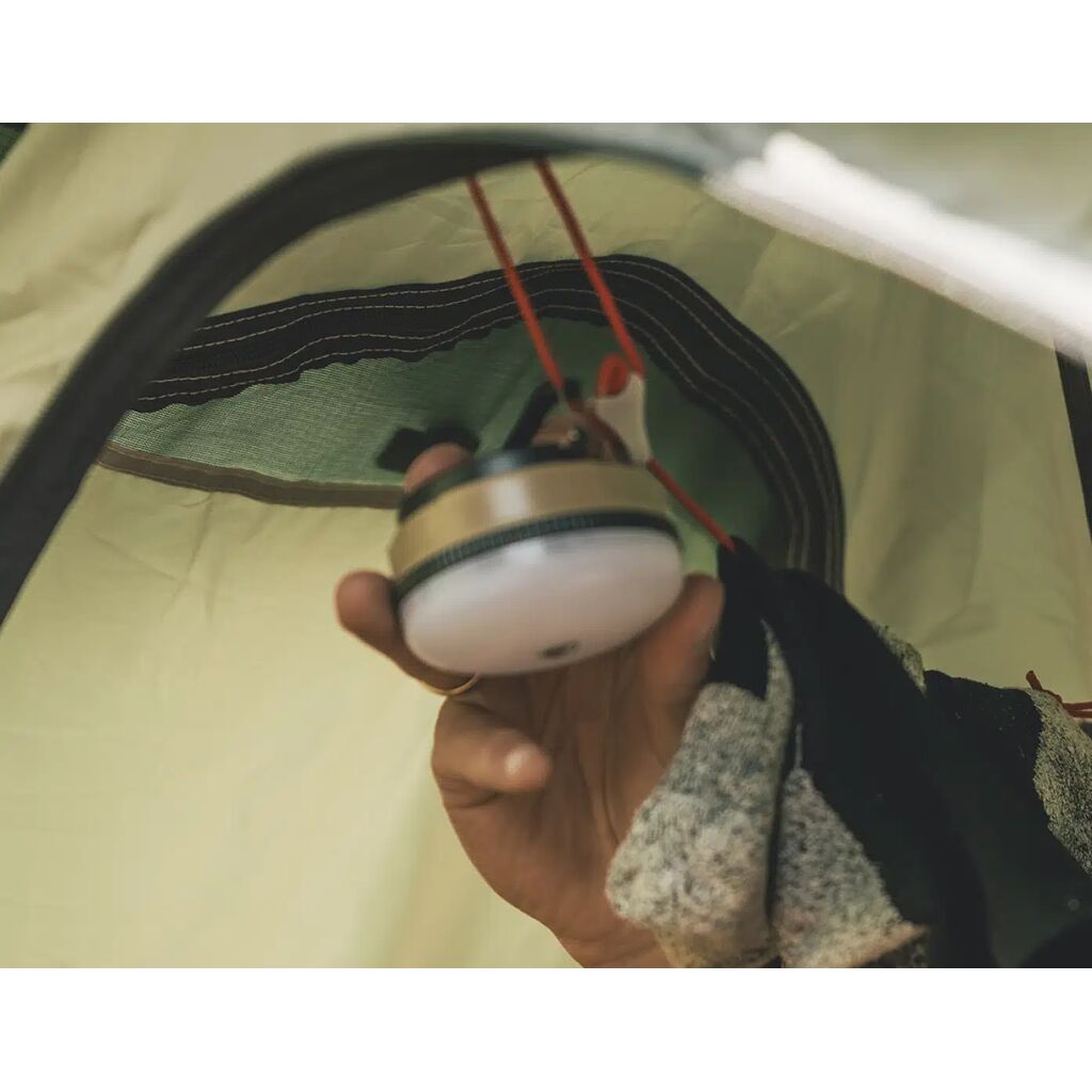 Kleine und leichte Campinglampe mit Aufhänger zur Verwendung als Deckenlampe. Betrieben mit 3 AAA-Batterien.