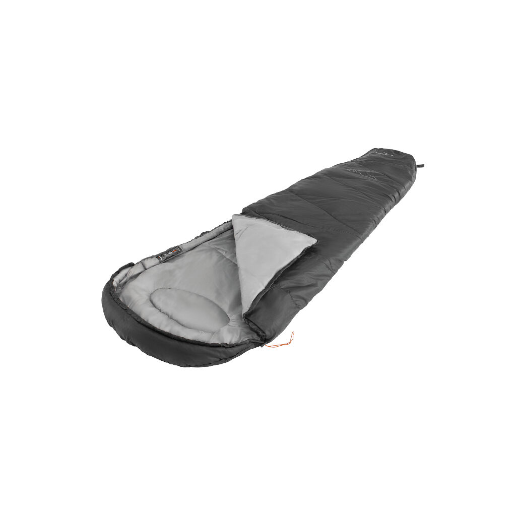 Campingschlafsack, der für die wärmere Jahreszeit der Zeltcampingsaison geeignet ist. Der Schlafsack hat eine Einzelschichtfüllung, eine verstellbare Kapuze und einen Reißverschluss mit Überlappung, der vor Kälte schützt. Der Reißverschluss kann vollständig geöffnet werden, sodass der Schlafsack als Decke verwendet werden kann, und er kann auch am Fußende geöffnet werden, um die Temperatur im Schlafsack während wärmerer Nächte zu regulieren.