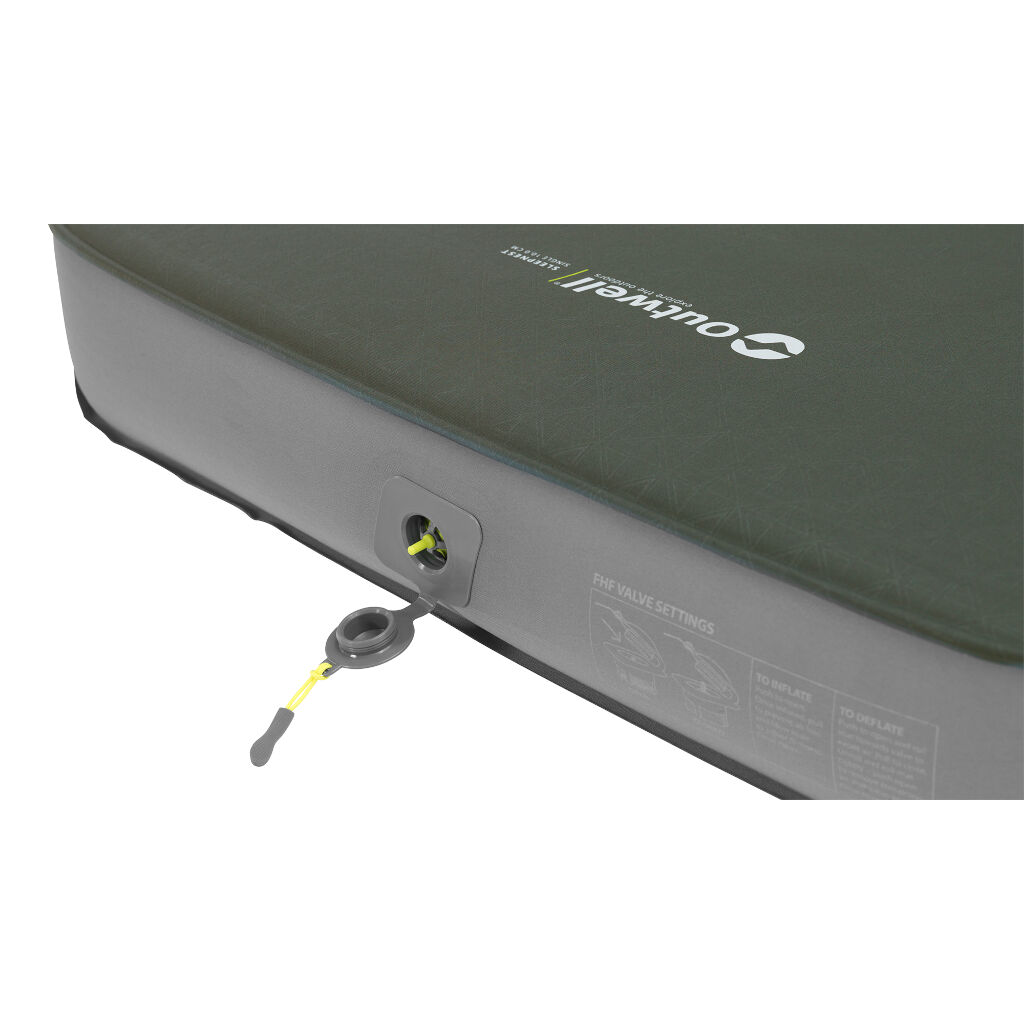 Selbstaufblasende Isomatte mit 10 cm Dicke und statischen Seiten, die bis zum Rand eine gute Unterstützung bieten. Durch die Verwendung von horizontalen Luftkanälen werden Gewicht und Packmaß reduziert. Outwells FHF-Ventil (Flat High-Flow) sorgt für ein schnelleres Aufblasen, ein einfacheres Entleeren und ragt nicht aus der Matratze heraus. Die Isomatte wird mit einer Tragetasche mit Schultergurt geliefert.