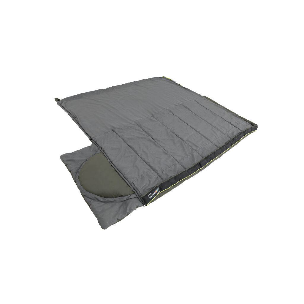 Warmer und geräumiger Campingschlafsack mit einem integrierten, abnehmbaren Kissen. Der Schlafsack kann auch vollständig geöffnet und als normale Decke verwendet werden. Zwei Temperaturstufen durch unterschiedliche Isolierung an Ober- und Unterseite sowie das verschiebbare Kissen ermöglichen es, die Isolierung je nach Saison anzupassen, indem die Seite für warme oder kalte Nächte nach oben gedreht wird.