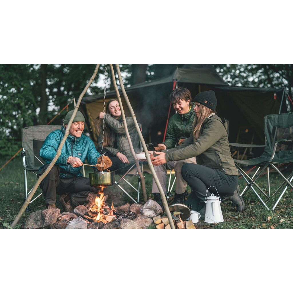 Stecken Sie 3 Stöcke aus der Natur in den Adapter und biegen Sie die Beine auseinander, schon haben Sie ein selbstgebautes Dreibein zum Kochen über offenem Feuer. Zum Adapter gehört eine Kette, mit der Sie die Temperatur/Höhe über dem Feuer einstellen können. Eine einfache und praktische Möglichkeit, Ihr eigenes Dreibein zu bauen.