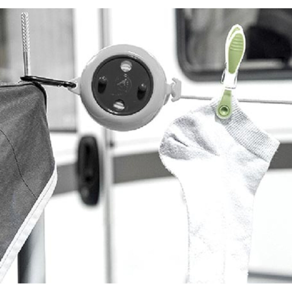 Intelligente und praktische Wäscheleine mit Karabinerhaken, die einfach zwischen zwei Punkten gespannt und fixiert wird, wenn Sie Ihre Wäsche aufhängen müssen.
