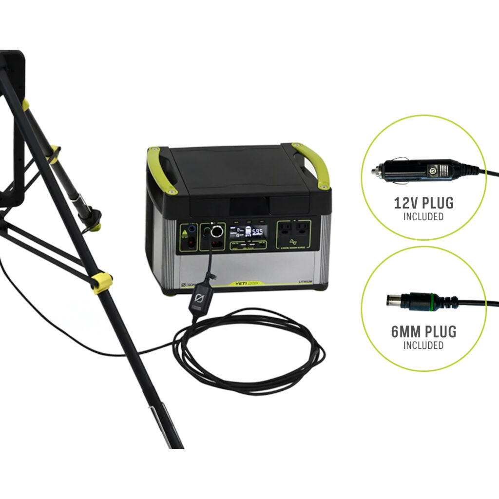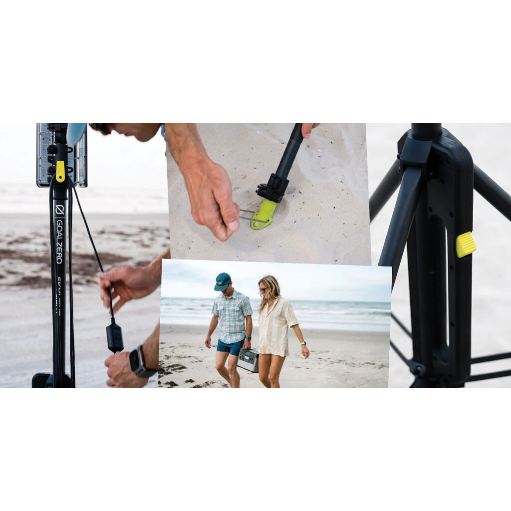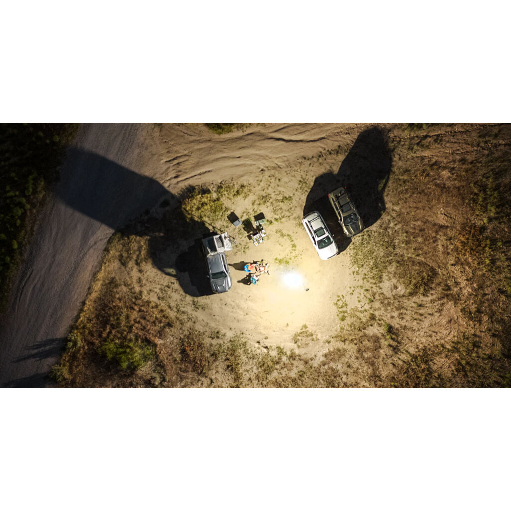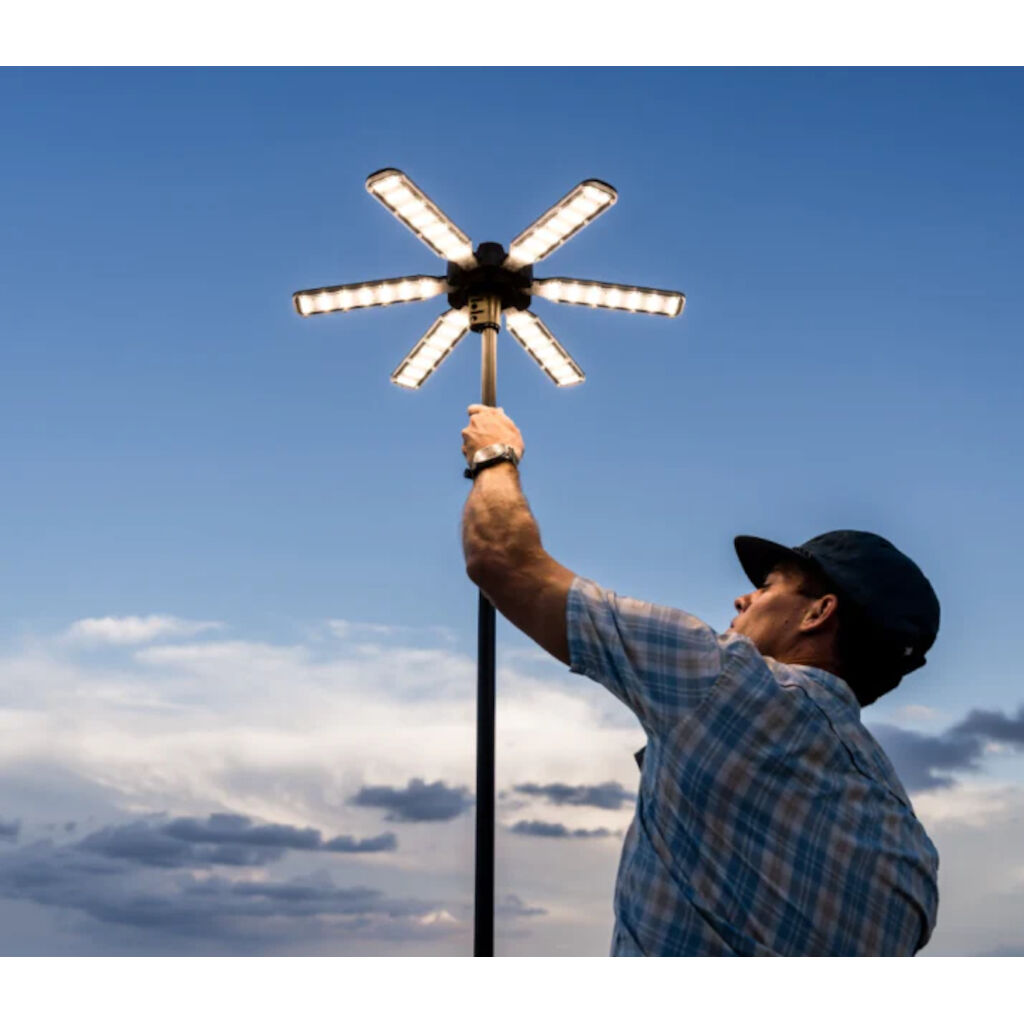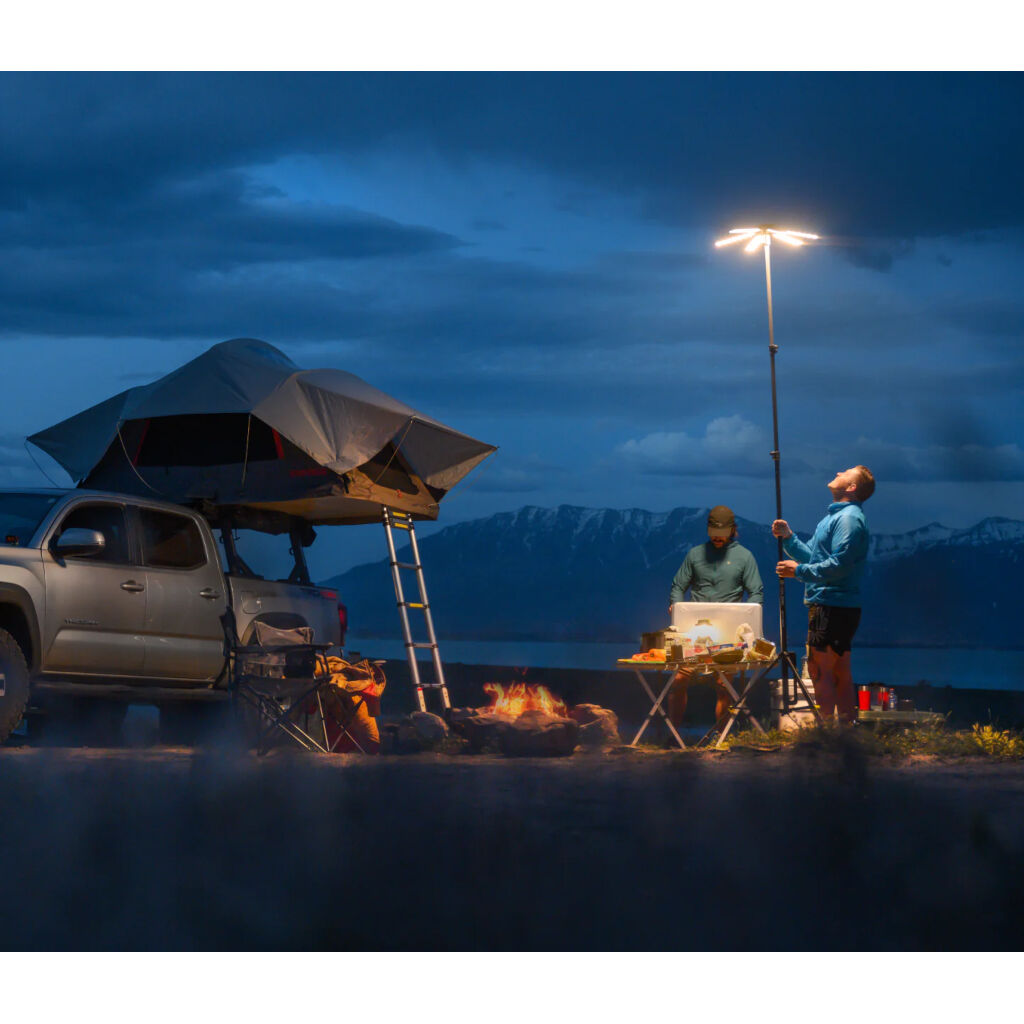 Intelligente tragbare Außenbeleuchtung, die perfekt für den Campingausflug oder das Basislager geeignet ist. Dank eines leichten Teleskopstativs mit einer maximalen Höhe von 3,6 Metern und verstellbaren Lampen kann sie bis zu 90 Meter leuchten, was Ihnen eine gute Außenbeleuchtung bietet, selbst wenn es wirklich dunkel ist. Die Kapazität der Lampen beträgt 6.000 Lumen, was Ihnen eine deutlich bessere Sichtbarkeit als eine gewöhnliche Campinglampe bietet. Sie hat einen eingebauten Akku, funktioniert aber am besten mit einer Power Station oder einer 12V-Quelle, an die sie angeschlossen werden kann.