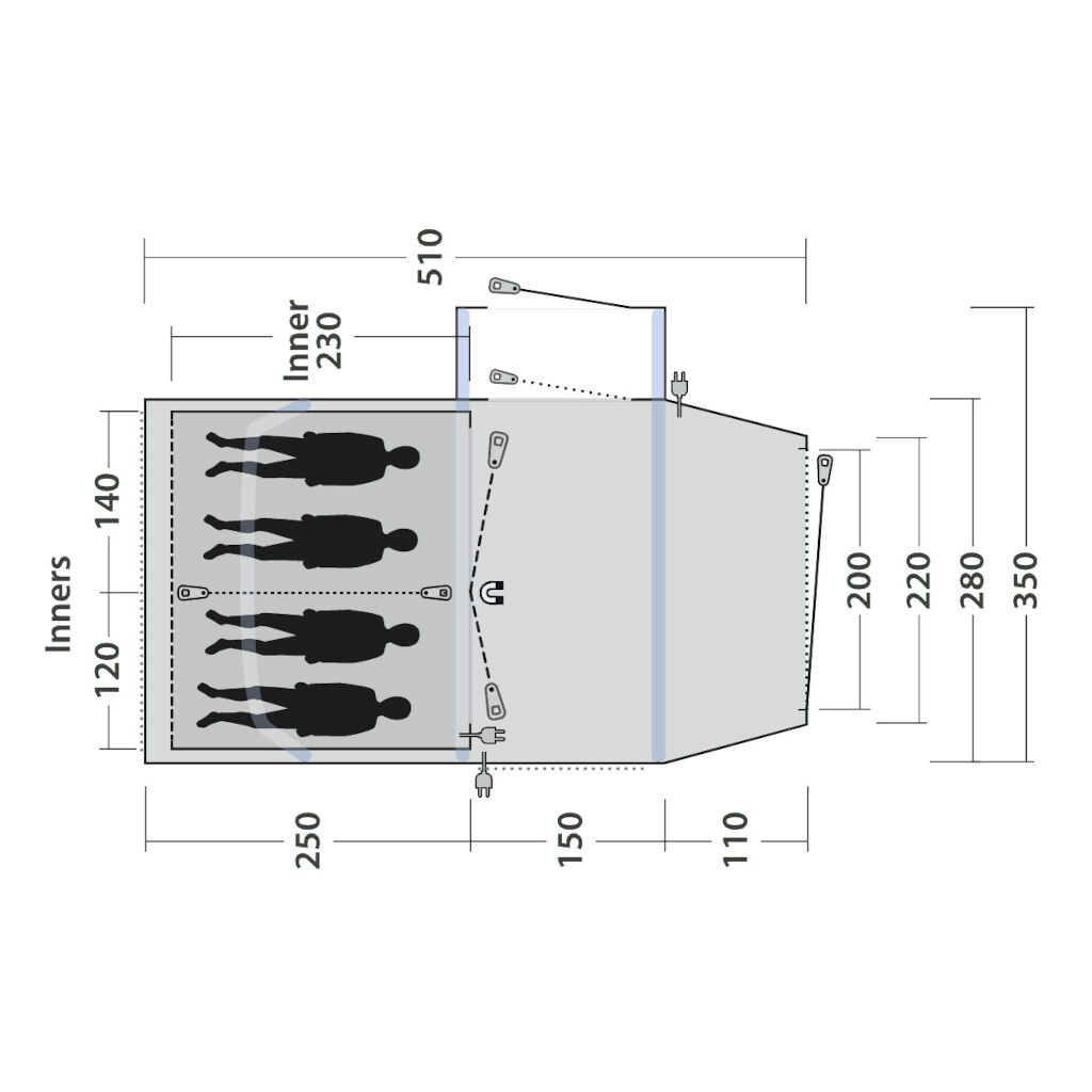 Die Schlafkabine ist in zwei Schlafzimmer (2+2) unterteilt. Die Wände zwischen den Schlafzimmern können entfernt werden, wenn die ganze Familie in einem großen Schlafzimmer zusammen sein möchte. Ein einzigartiges Merkmal ist die extra geräumige Schlafkabine (Outwell Ambassador Bedroom), die zusätzlichen Platz sowohl in der Länge als auch in der Höhe bietet, im Vergleich zu Standard-Zeltkabinen, bei denen die Betten oft die gesamte Länge einnehmen und die Rückwand in großen Teilen des Raums niedrige Höhe verursacht. Perfekt, um Gepäck in der Schlafkabine zu verstauen oder einfach mehr Platz zum Bewegen zu haben.