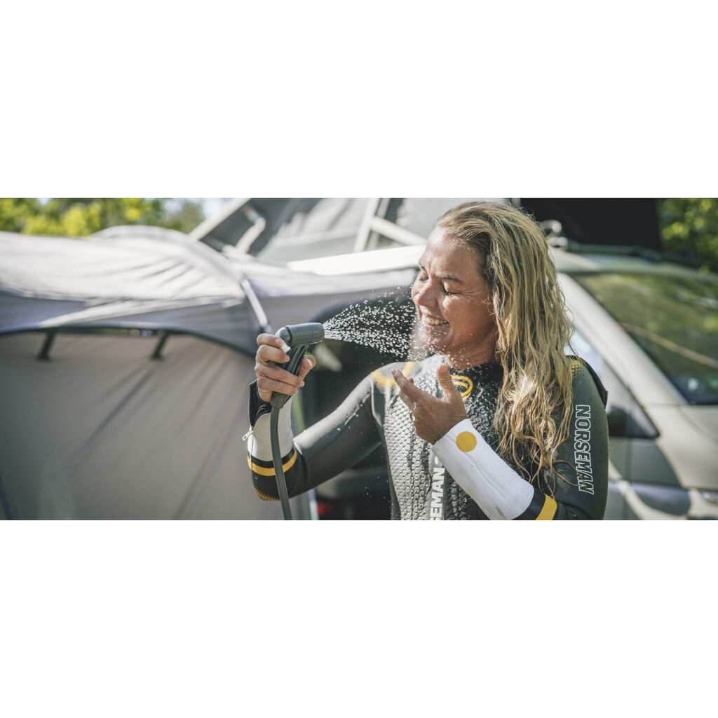 Keine Dusche in der Nähe? Ob zum Abspülen der Füße nach dem Strand, Reinigen von Neoprenanzügen oder Waschen deines Hundes – diese Dusche ist bereit. Das eingebaute PVC-Thermometer sorgt stets für die ideale Wassertemperatur.