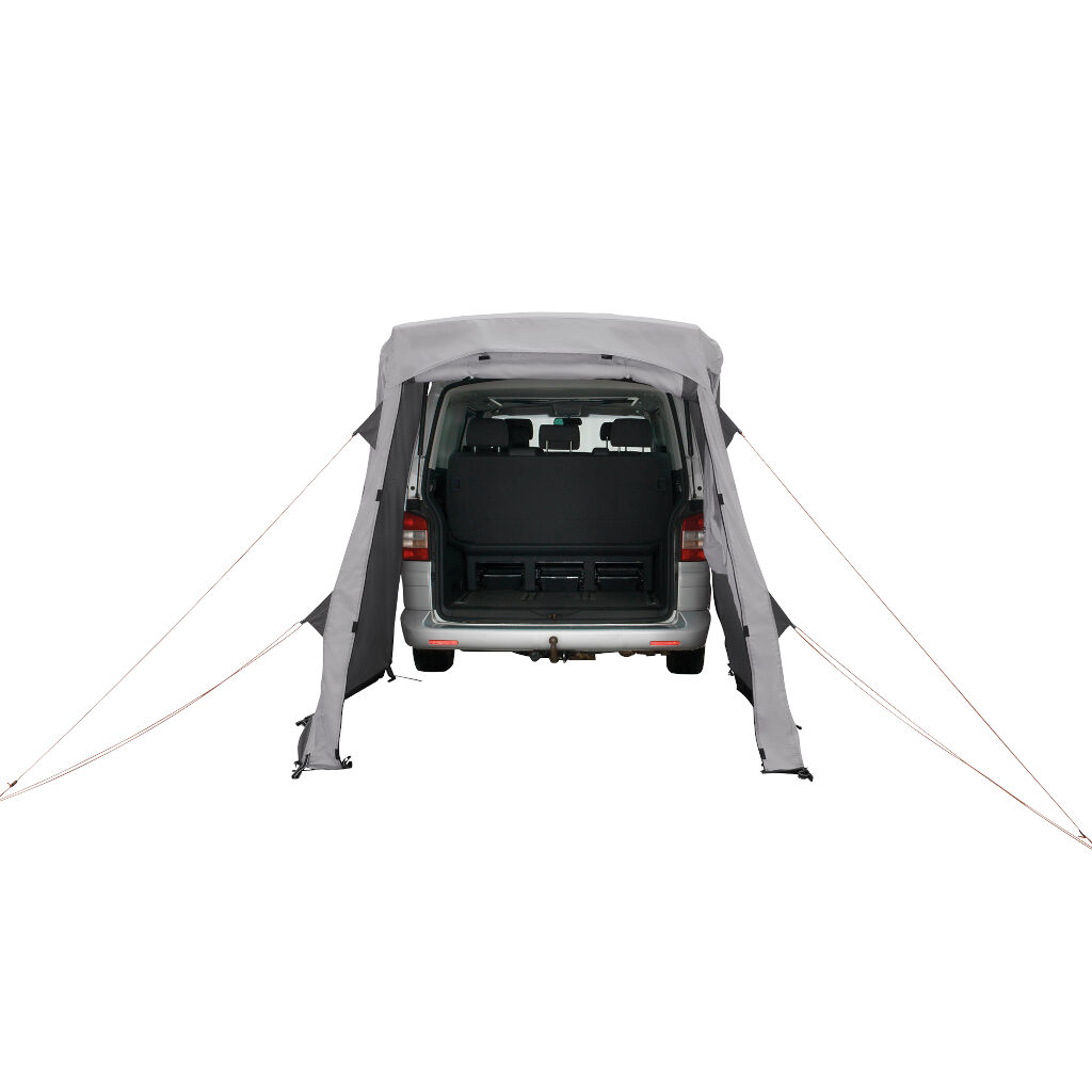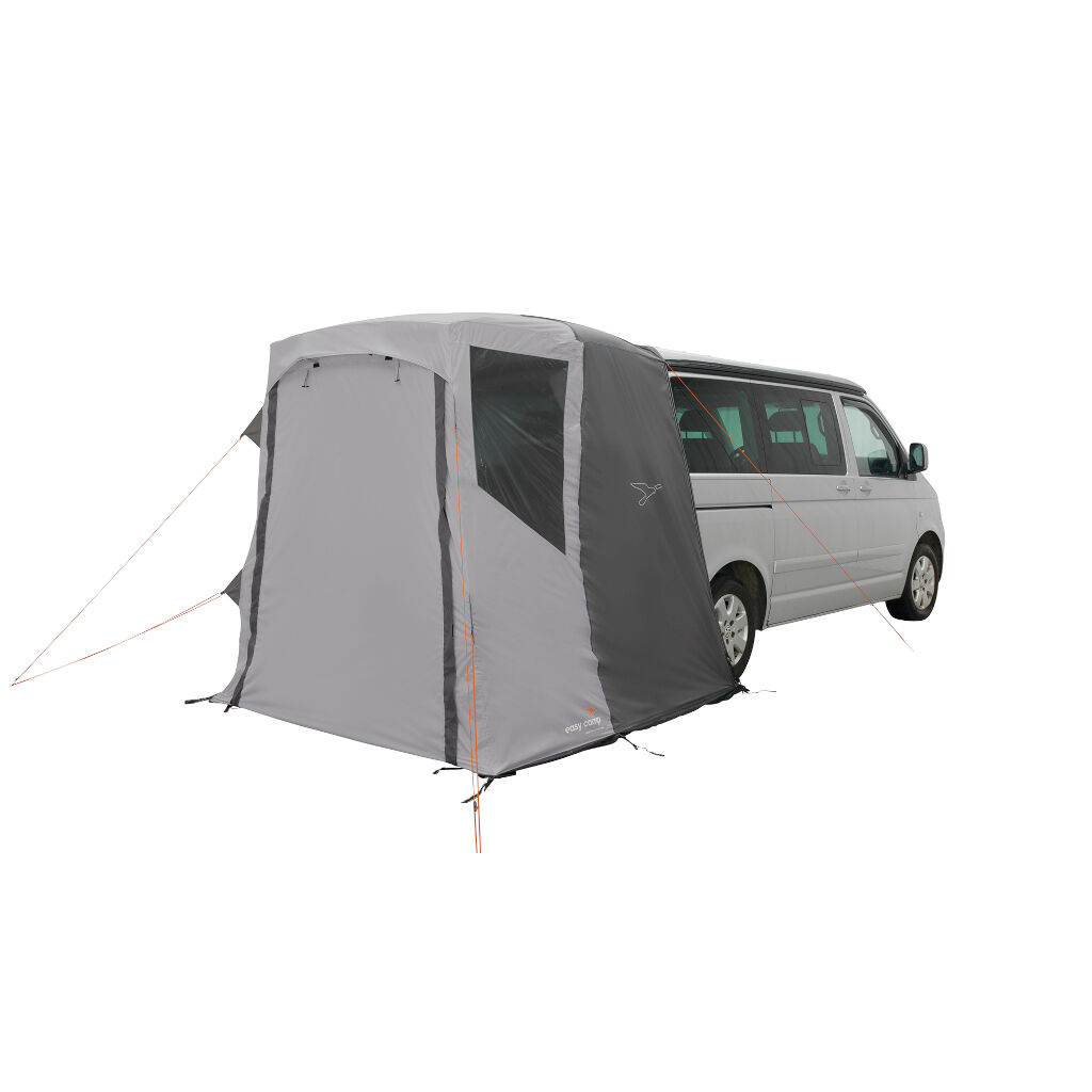 Das Easy Camp Krossbu ist ein Autovorzelt, das am Heck eines Campervans montiert wird und zusätzlichen geschützten Raum für Kochen, Ausrüstung oder Entspannung bietet. Passend für VW T5/T6/T6.1, MB W639/W447 und ähnliche Fahrzeuge. Einfache Montage mit Abspannleinen und aufstellbarer Vordertür als Sonnendach mit den mitgelieferten Stangen.