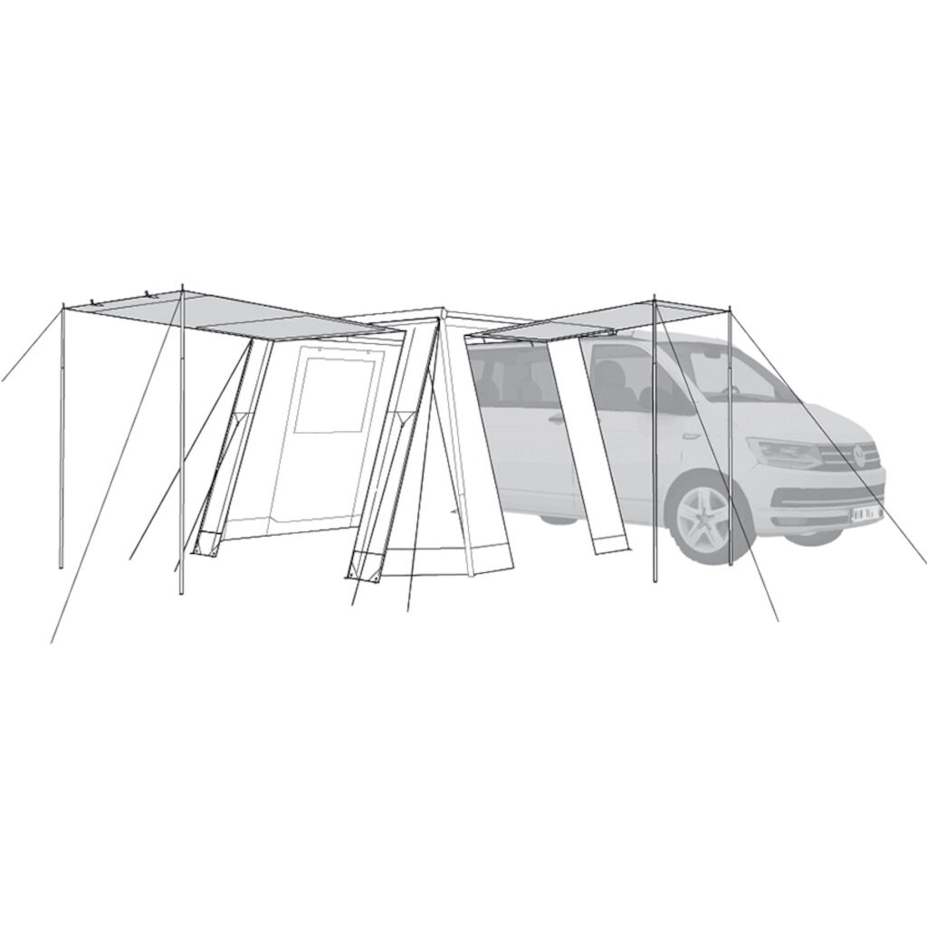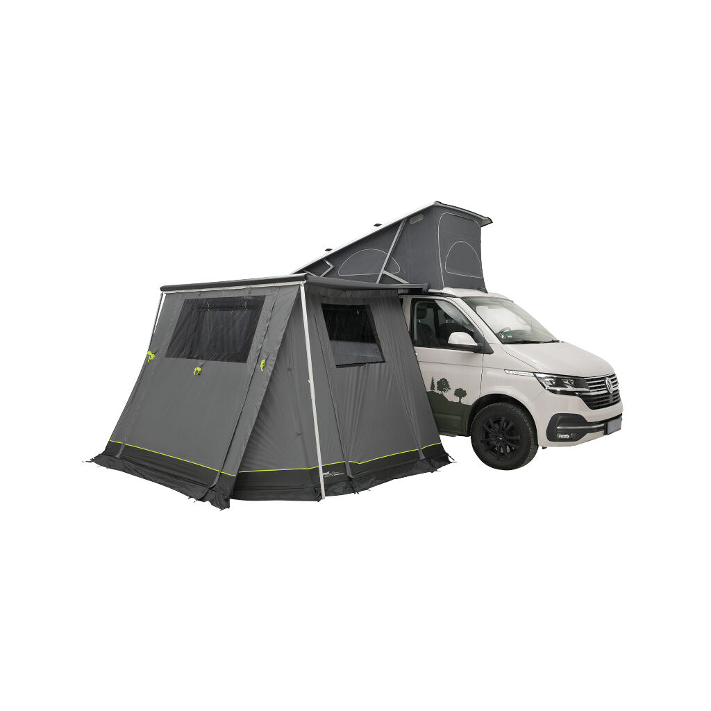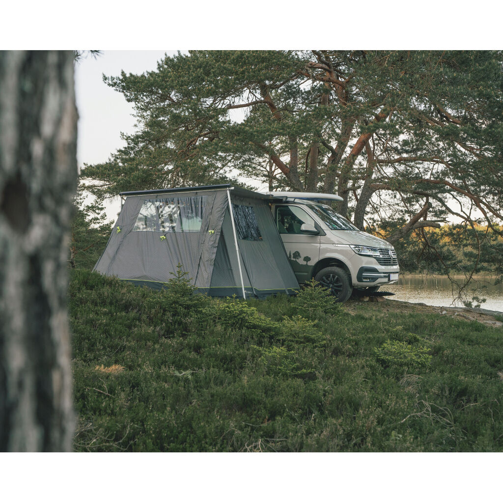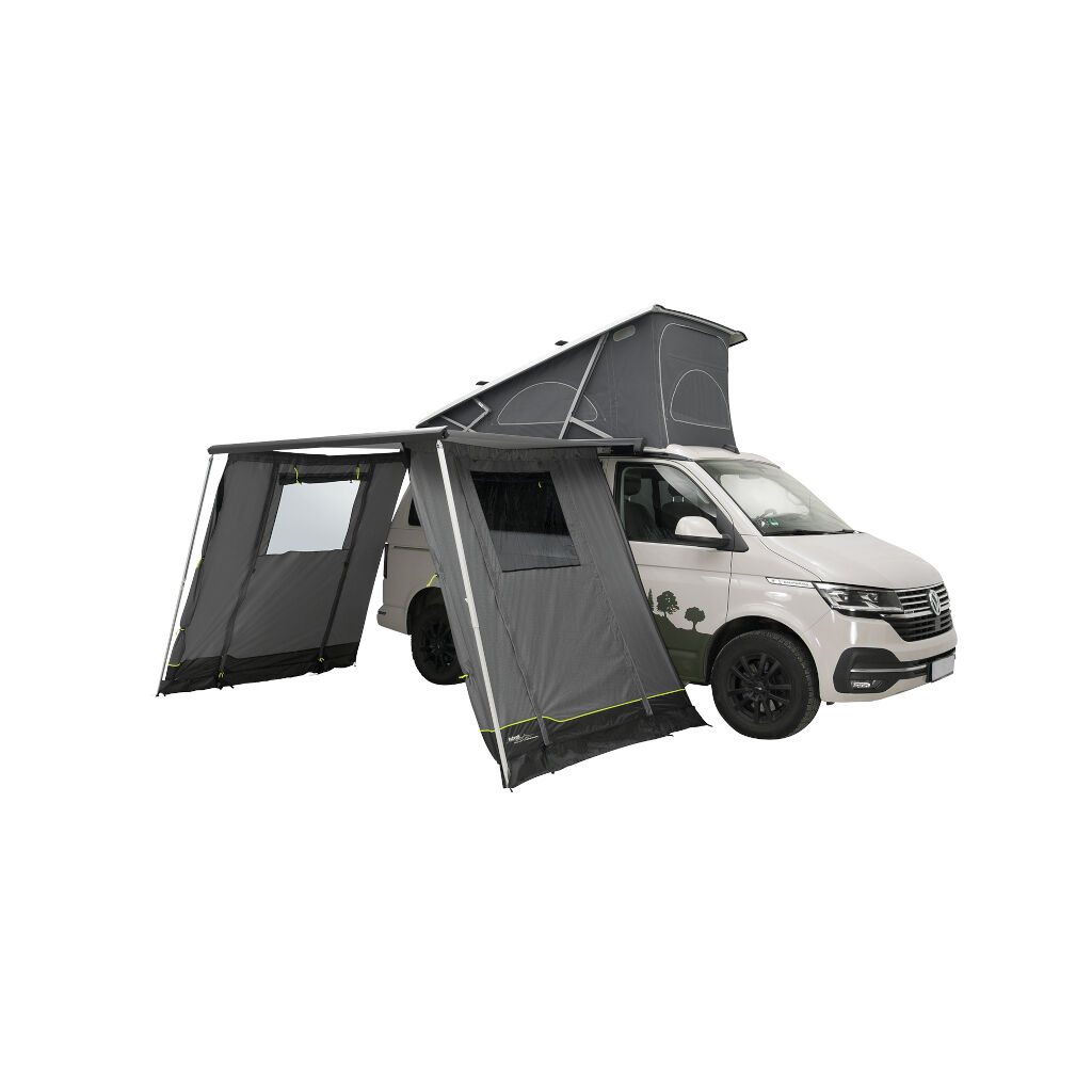 Erweitern Sie Ihren Raum, indem Sie eine geschützte Fläche unter Ihrer Markise schaffen. Mit einer schnellen und einfachen Montage haben Sie in wenigen Minuten einen praktischen und flexiblen Raum. Große getönte Fenster an beiden Seiten und eine Front mit Tür ermöglichen einen einfachen Zugang zum Bereich. Das Markisenzelt ist für Fahrzeugmodelle VW T5/T6/T6.1, Multivan, Caravelle, Transporter, California, MB W639/W447, V-Klasse, Vito, Marco Polo und ähnliche Fahrzeuge konzipiert.