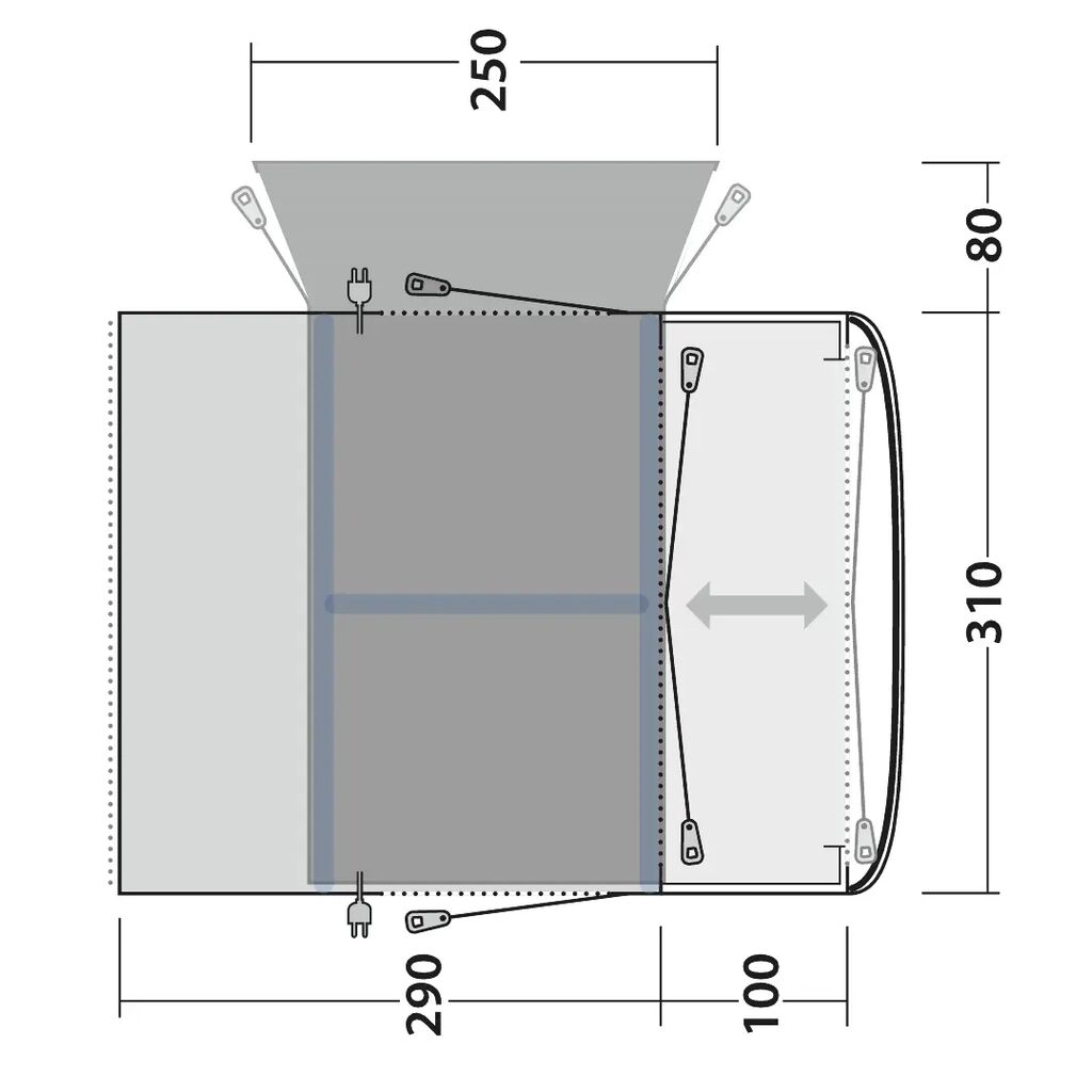 Das Jonesville 290SA bietet hohen Komfort und viel Platz. Durch die seitliche Ausrichtung entlang des Fahrzeugs ist es ganze 390 cm lang – perfekt zum Entspannen, auch bei Nutzung einer Schlafkabine. Vorgebogene Luftschläuche sorgen für eine angenehme Stehhöhe. Der Zugang erfolgt über die große Fronttür, die Seitentür oder die kleinen Türen an der Schleuse. An heißen Tagen lässt sich die gesamte Front öffnen, um eine überdachte Terrasse zu schaffen. Gegen Insekten schützt das Moskitonetz an der Front- oder Seitentür. Der eingenähte Boden verhindert Zugluft und Feuchtigkeit.