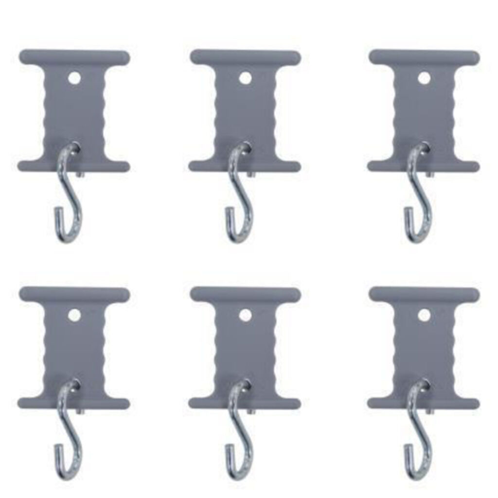 Hängen Sie Ihre Zubehörteile mit Hilfe dieser Haken auf, die zu Kederleisten oder Markisenfronten mit 5 oder 7 mm Spur passen. 6 Haken mit zugehörigen Halterungen, die einfach in 5 oder 7 mm Spur eingesetzt werden.