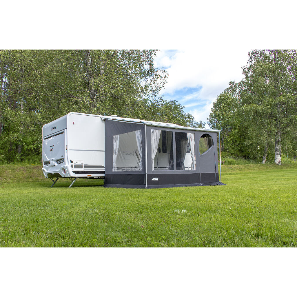 Verwandeln Sie Ihr Sackmarkise in ein Zelt. Seiten und Front mit Tür von Svenska Tält, passend für sowohl Fiamma Caravanstore XL Sackmarkisen als auch Thule Omnistor 1200 Sackmarkisen. Einfach an der Markise zu montieren.