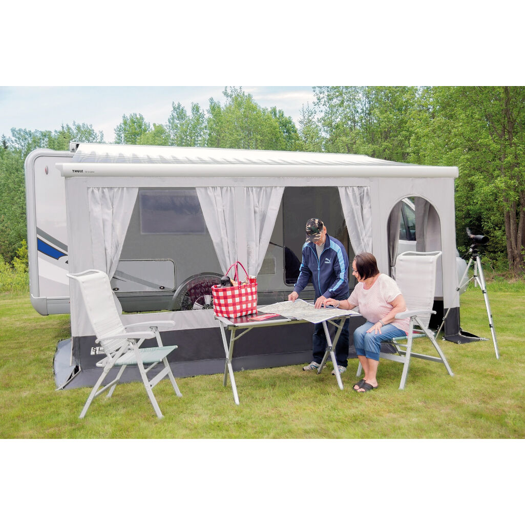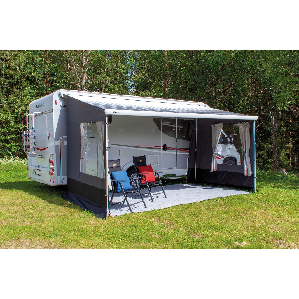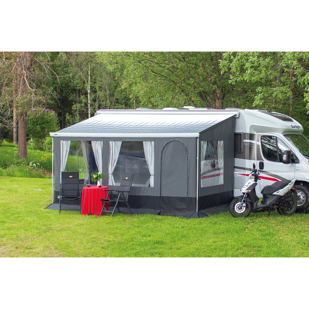 Verwandeln Sie Ihre Wohnmobilmarkise in ein Zelt. Seiten und Front mit Tür von Svenska Tält, passend für Markisen von Fiamma, Dometic und Thule. Einfach an der Markise zu montieren.