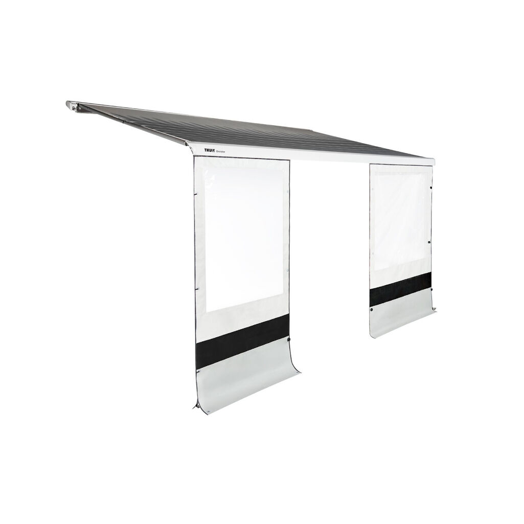 Frontsektionen mit Fenstern für Ihre Thule-Markise. Schützt sowohl vor Wind als auch vor Regen. Einfach in die Schiene der Markise zu montieren. Die Frontsektion kann aufgerollt und an der Markise befestigt werden, wenn sie nicht verwendet wird.