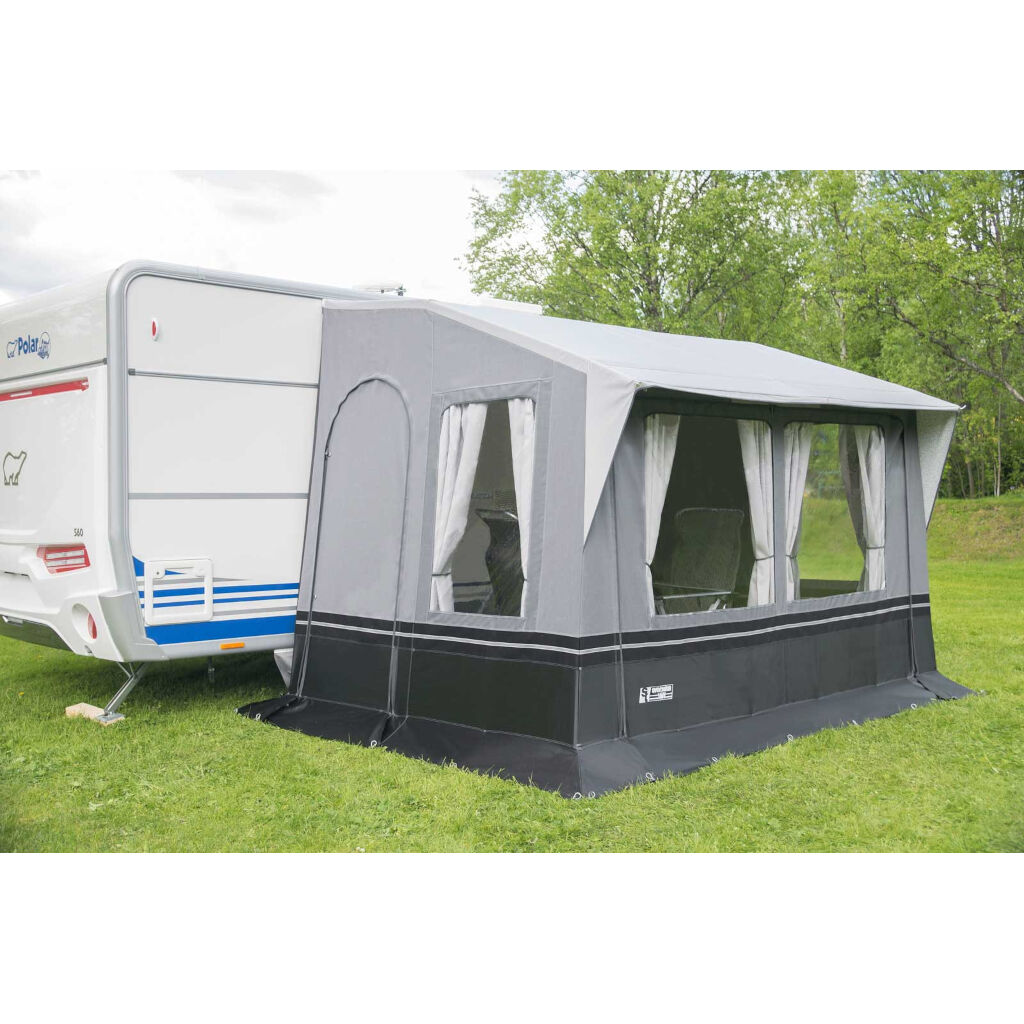 Universalvorzelt von Svenska Tält, das das ganze Jahr über funktioniert. Das Vorzelt hat eine Tiefe von 220 cm und Sie können zwischen zwei Breiten wählen: 320 und 400 cm. Beide Größen haben die gleichen Funktionen wie die größeren Vorzelte von Svenska Tält, wie abnehmbare Front, abnehmbare Türen mit überdeckten Reißverschlüssen und passen zu den meisten Wohnwagen auf dem Markt. Ergänzen Sie es mit einem Innendach für ein besseres Klima oder einer Wintersicherung für Wintercamping in schneereichen Bedingungen. Wählen Sie Vorhänge, um ein Zelt zu erhalten, das zu Ihrem Stil passt.