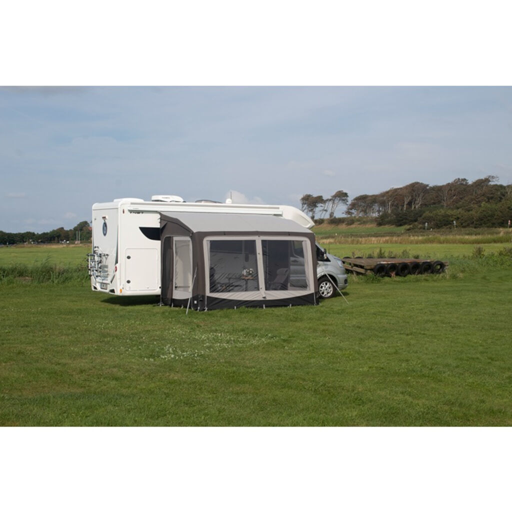 Pure 330 von Telta ist ein sehr helles und angenehmes Luftvorzelt für sowohl Wohnwagen als auch Wohnmobil. Das große Fensterpanel an der Front kann sowohl gelöst als auch aufgerollt werden, um das Zelt tagsüber als Sonnendach zu nutzen und dann, wenn es kühler wird, wieder zu montieren. Ein stärkeres, atmungsaktives Gewebe sorgt sowohl für ein besseres Klima im Zelt als auch für eine längere Lebensdauer. Außerdem ist es wirklich schnell aufgebaut. Befestigen Sie das Zeltgewebe in der Zeltschiene am Wohnwagen oder in der Schiene an der Markise des Wohnmobils, pumpen Sie die in das Zeltgewebe integrierten Kanäle von einem Ventil auf und befestigen Sie die Abdichtung gegen den Wohnwagen/das Wohnmobil im Boden, so steht das Zelt bereit. Schnell, einfach und bequem.