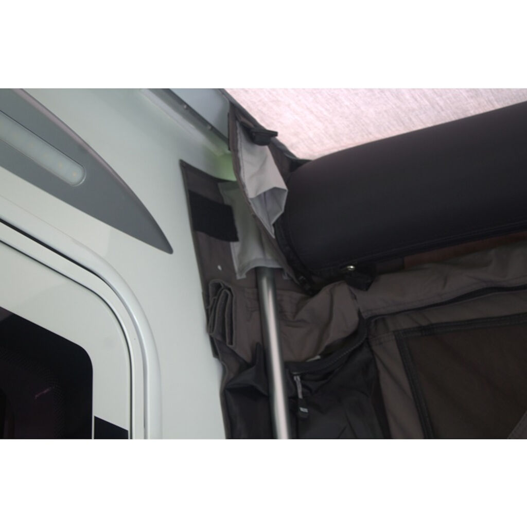 Wohnwagen: Der Wohnwagen benötigt einen geraden Teil der Leiste, der 330 cm lang ist. Wenn eine Seite des Zeltes über ein Fenster oder eine Luke ragt, kann dies mit Hilfe von Stangen (nicht im Lieferumfang enthalten) abgedichtet werden.