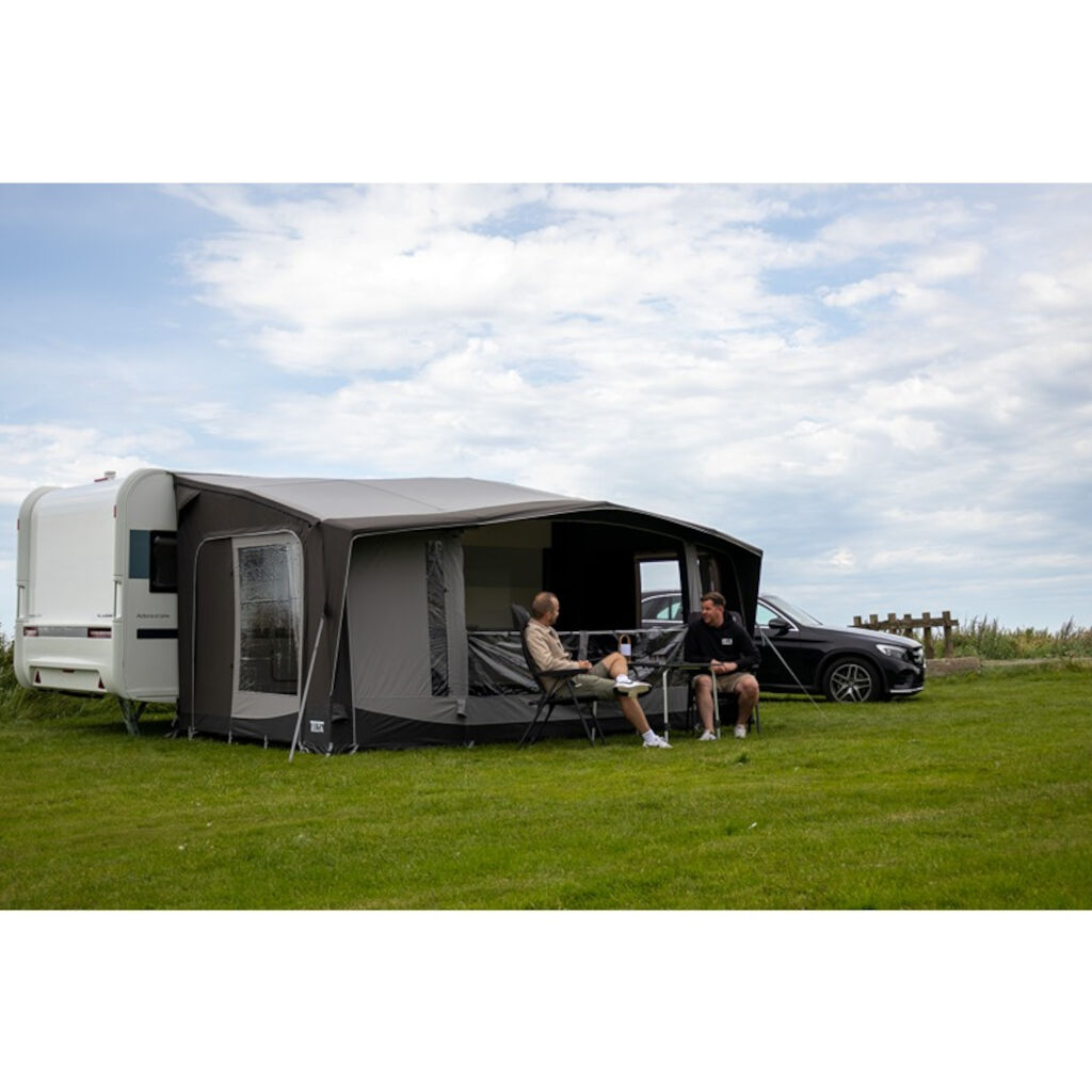 Das Telta Scenic 490 ist ein geräumiges und komfortables Vorzelt mit einer Tiefe von 300 cm und großen, aufrollbaren Fensterpaneelen. Die großen Fenster an der Vorderseite des Zeltes sorgen für angenehmes Licht und ein großzügiges Raumgefühl. Falls mehr Privatsphäre gewünscht ist, können die Vorhänge zugezogen werden. Das Zelt ist schnell aufgebaut, und sein widerstandsfähiges Gewebe ist atmungsaktiv – im Gegensatz zu den meisten anderen Luftvorzelten und Reisevorzelten – wodurch Kondenswasser reduziert und das Klima an heißen Tagen angenehmer wird. Perfekt für häufiges Campen oder Sommerreisen in den Süden. Dank der doppelten Kederleisten kann das Zelt sowohl an Wohnwagen als auch an Wohnmobile montiert werden. Einfach die Zelthaut in die Schiene des Wohnwagens oder der Wohnmobilmarkise einziehen, vier Heringe an den Ecken befestigen und die integrierten Luftkanäle mit einem einzigen Ventil aufpumpen. Danach die Abdichtung am Wohnwagen anbringen – und das Zelt ist bezugsfertig.