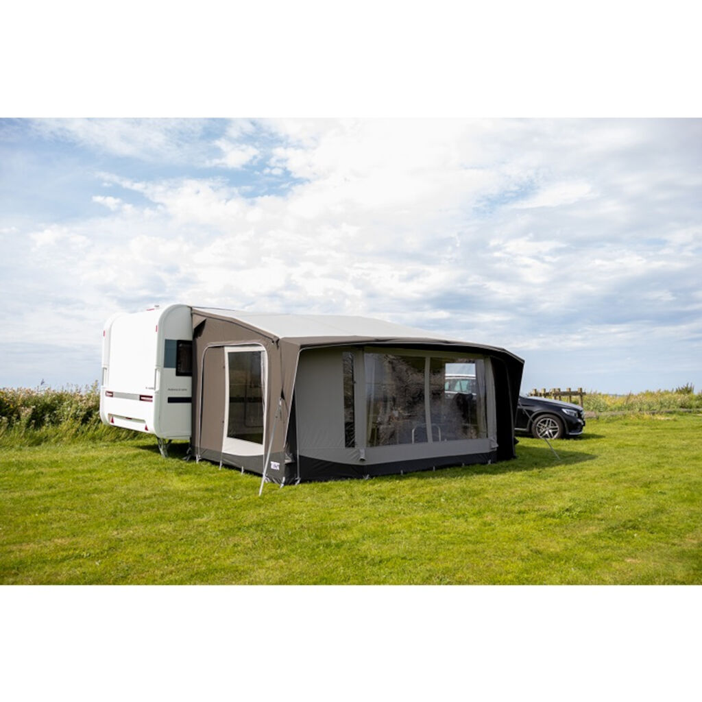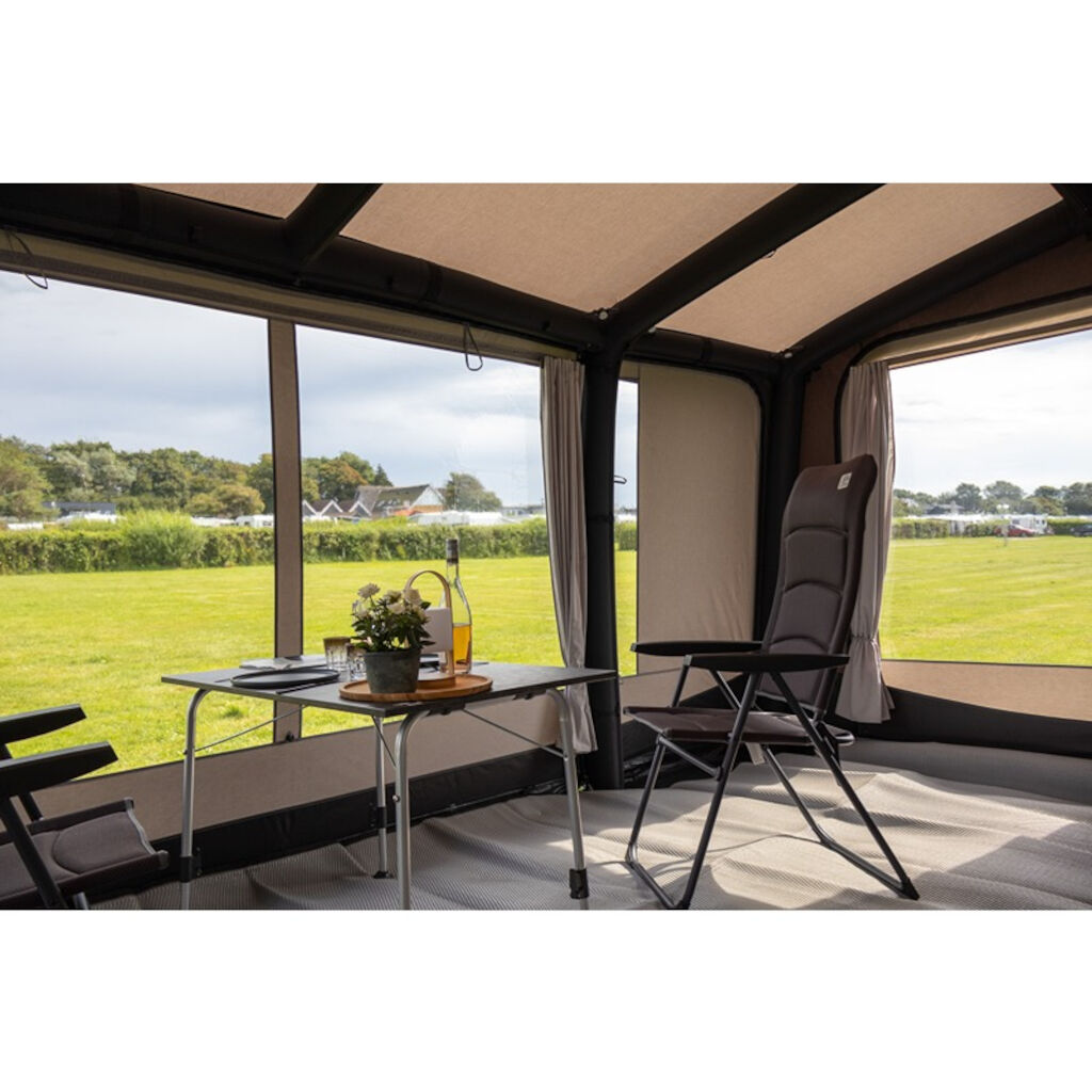 Telta Scenic 490 ist ein Vorzelt, das Luftkanäle anstelle von Zeltstangen verwendet. Mit einer Tiefe von 300 cm und schrägen Luftkanälen bietet das Vorzelt ein sehr geräumiges Innenleben. Ein robusteres, atmungsaktives Gewebe sorgt für ein besseres Klima im Zelt und eine längere Lebensdauer, wodurch es sich auch für längere Aufenthalte oder häufiges Camping eignet. Außerdem ist es sehr schnell aufgebaut. Befestigen Sie das Zeltgewebe an der Schiene des Wohnwagens oder an der Schiene der Markise des Wohnmobils, pumpen Sie die in das Zeltgewebe integrierten Kanäle auf, befestigen Sie es am Boden und dichten Sie es gegen den Wohnwagen/Wohnmobil am Boden ab. Das Zelt ist fertig. Schnell, einfach und bequem.