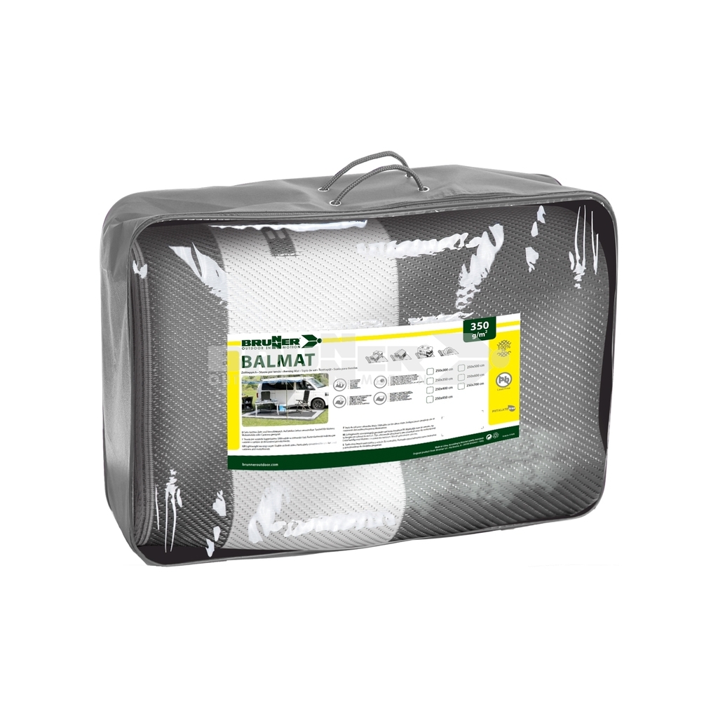 Leichtgewichtsmatte für Wohnwagen- und Wohnmobilmarkisen mit Befestigungen in den Ecken. Auf beiden Seiten verwendbar. Atmungsaktiv und UV-beständig. Einfach zu transportieren in der mitgelieferten Tasche.