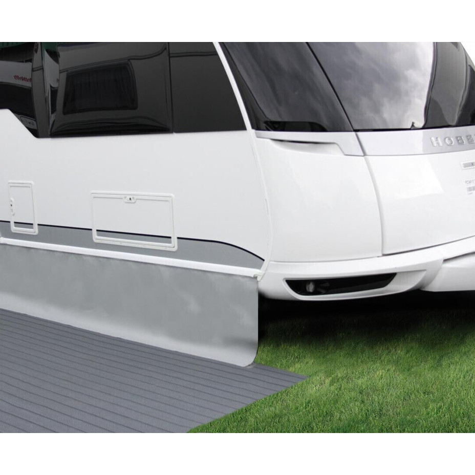 Bodenkappe aus weichem Gewebe mit Leinenstruktur von Hindermann. Hält Ungeziefer fern und schützt vor Zugluft unter dem Wohnwagen.