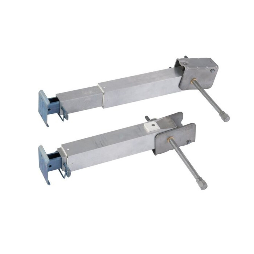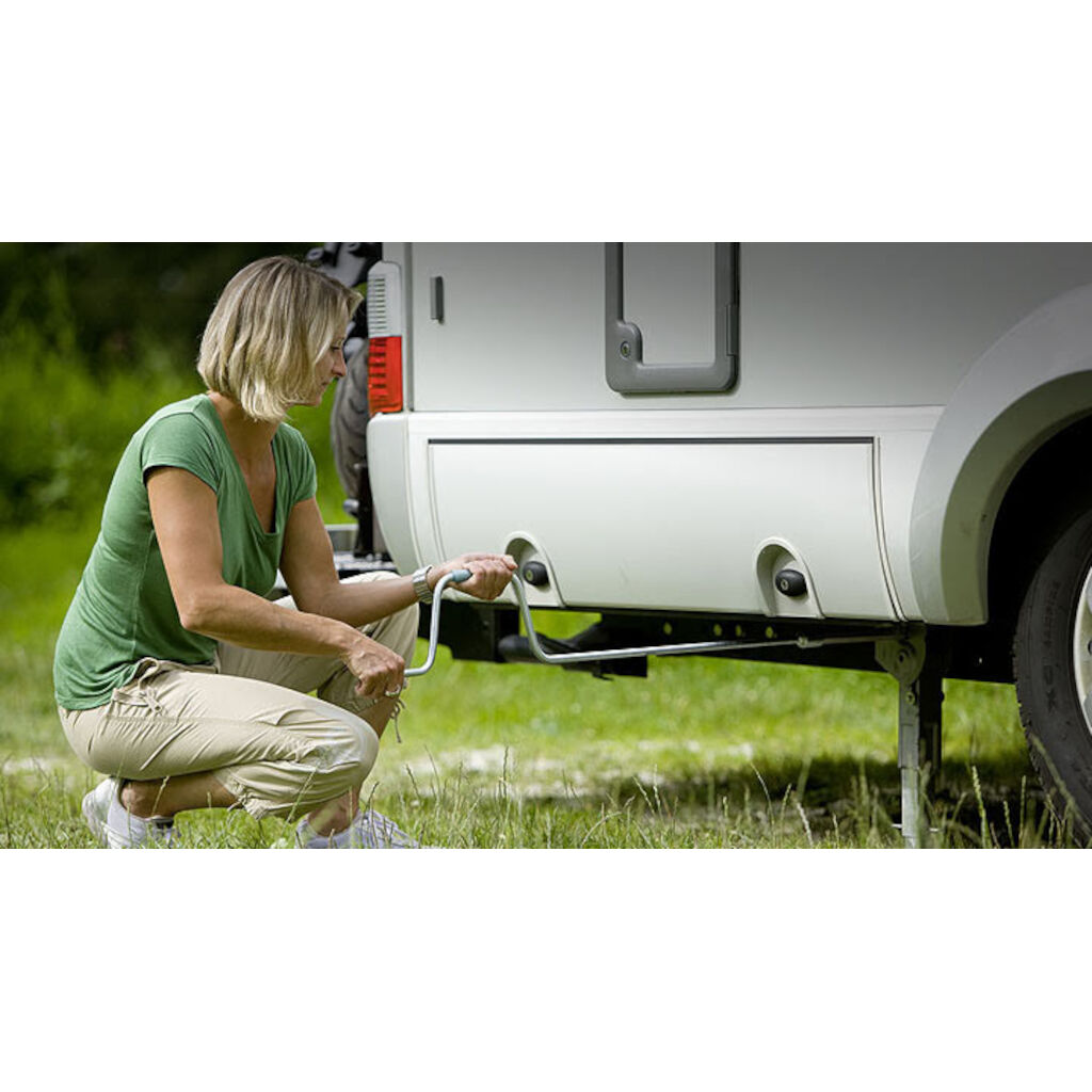 Stützbeine zur Montage am Heck von Wohnmobilen mit AL-KO AMC-Chassis. Sie können auch an anderen Rahmen montiert werden, dies erfordert jedoch das Bohren von Löchern und möglicherweise eine Verstärkung. Die Stützbeine werden manuell hoch- und heruntergekurbelt (Hinweis: Kurbel ist nicht im Lieferumfang enthalten). In der Endposition dreht sich die Kurbel nach oben und rastet automatisch ein, um sicherzustellen, dass die Beine während der Fahrt nicht versehentlich ausklappen. Die ClickFix-Stützbeine verfügen zudem über eine integrierte Sicherheitsmechanik, die eine Abfahrt trotz ausgefahrener Stützbeine ermöglicht, sodass Schäden an sowohl den Stützbeinen als auch dem Wohnmobil vermieden werden.