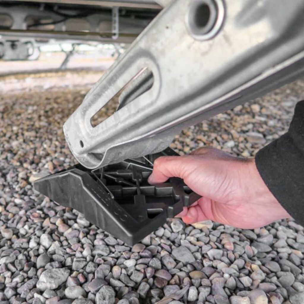 Große Stützfußplatte, die verhindert, dass der Stützfuß auf weichen Untergründen einsinkt oder sich bewegt. Erhöht die Stabilität des Wohnwagens. Kann während der Fahrt angebracht bleiben.