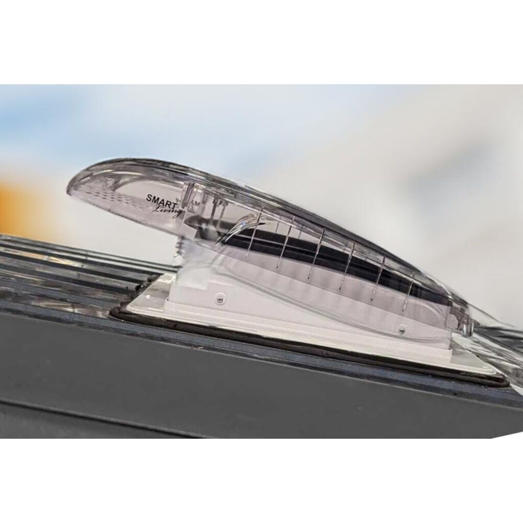 Elektrische Dachventilation mit 10 verschiedenen Modi, thermostatgesteuert, LED-Beleuchtung, Verdunkelungsvorhang sowie eine Fernbedienung, die Lüfter und Beleuchtung steuern kann (kann auch manuell über das Bedienfeld der Dachluke eingestellt werden). Einfache Installation, da der Lüfter in die Standard-Dachöffnung (40 x 40 cm) passt. Die Thermostatsteuerung erleichtert es, eine gleichmäßige Temperatur zu halten, ohne die Luke selbst einstellen zu müssen. Ein großer Vorteil der Smart Living-Lösung ist, dass sie auch einen eingebauten Verdunkelungsvorhang und zwei integrierte LED-Streifen mit einer angenehmen Farbtemperatur hat. Der Lüftermotor ist reversibel, sodass man sowohl Luft in als auch aus dem Wohnwagen oder Wohnmobil blasen kann.