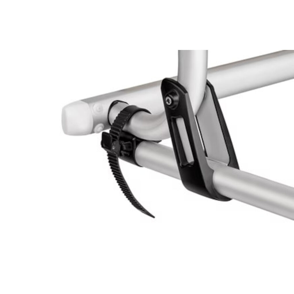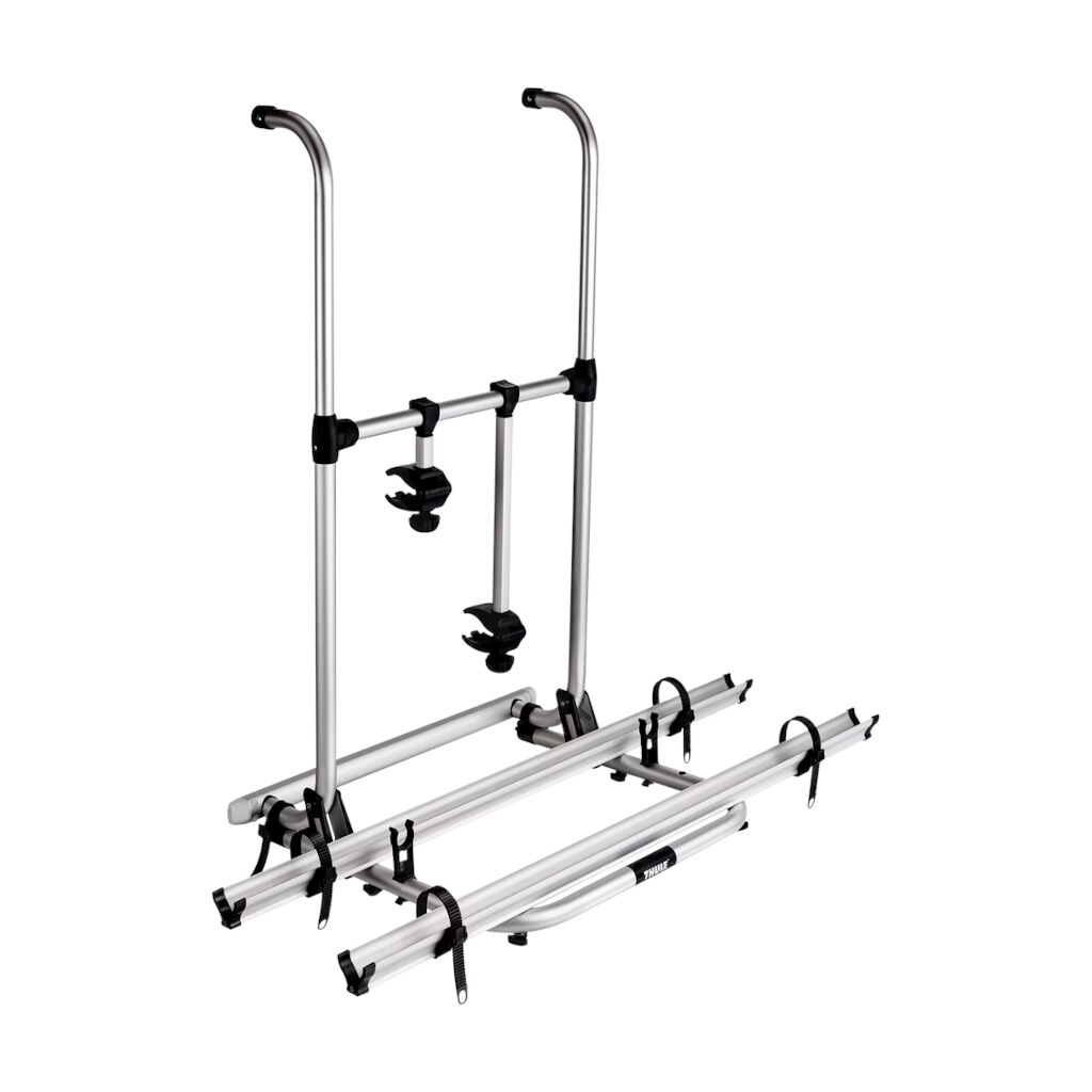 Fahrradträger von Thule für zwei Fahrräder, die hinten am Wohnwagen oder Wohnmobil montiert werden. Kann mit einem zusätzlichen Halter erweitert werden, um drei Fahrräder aufzunehmen (Zubehör). Der Träger kann hochgeklappt werden, wenn er nicht verwendet wird.