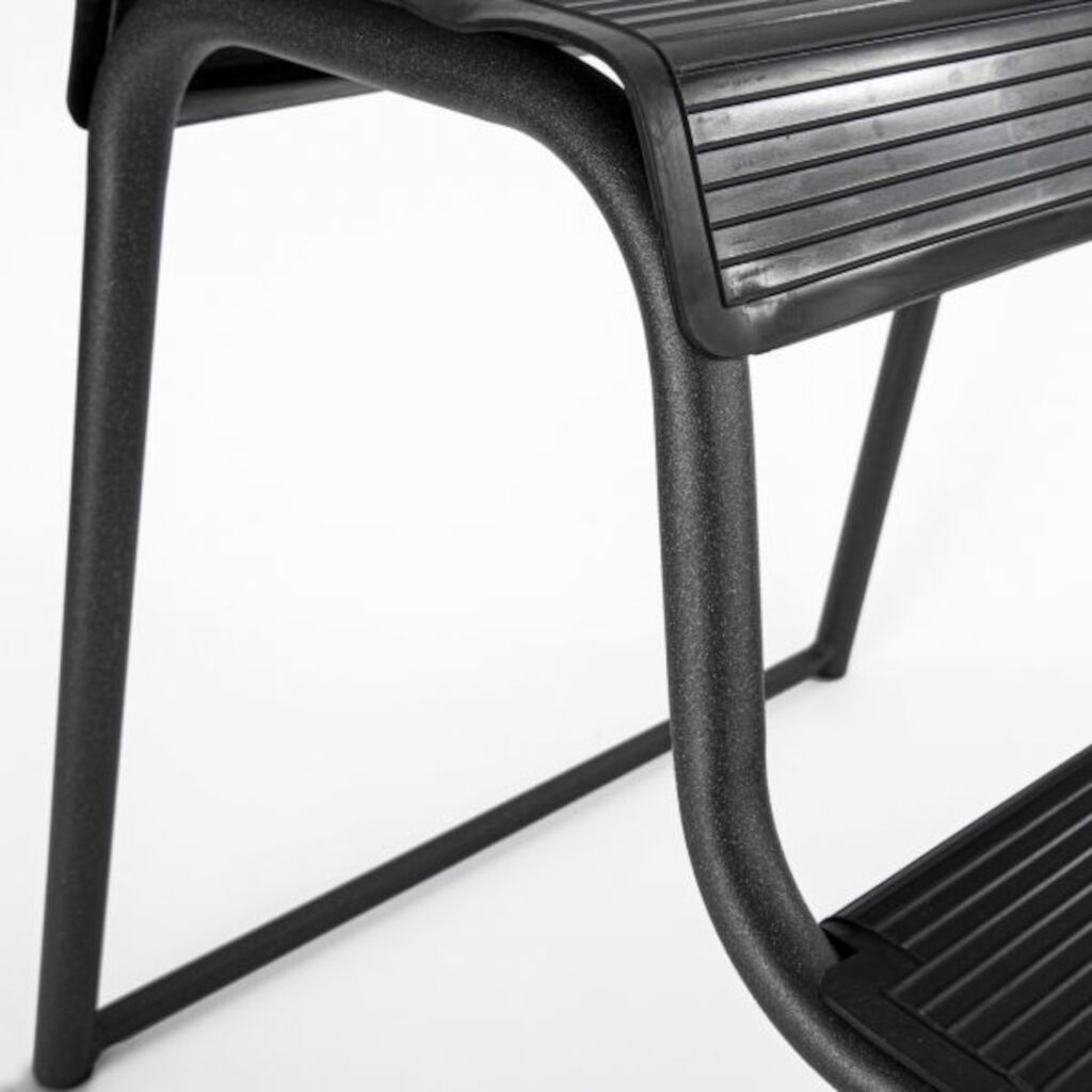 Doppeltreppe aus pulverbeschichtetem Stahl mit rutschfester Oberfläche und einer tief liegenden Schiene, die verhindert, dass die Treppe in den Boden sinkt. Der Rutschschutz ist austauschbar und kann zusätzlich erworben werden.