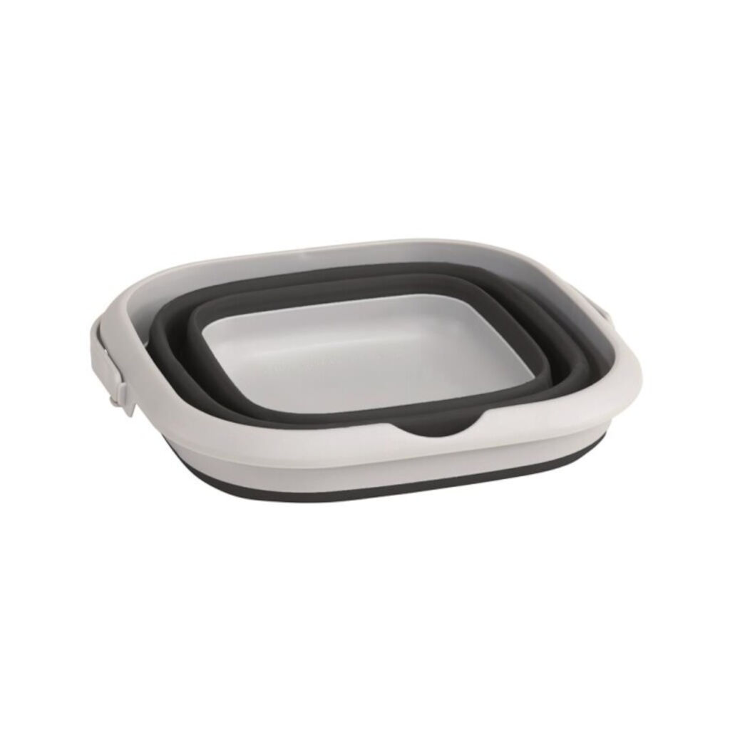 Intelligenter faltbarer Eimer, der auf nur 5,5 cm Höhe zusammengedrückt werden kann. Perfekt geeignet, um das Geschirr zum Servicehaus zu tragen, als Mülleimer oder als ganz normaler Eimer. Die Konstruktion besteht aus silikonisiertem Gummi, das hitzebeständig ist, leicht zu reinigen und auch dafür sorgt, dass sich der Eimer nicht ungewollt zusammenfaltet.