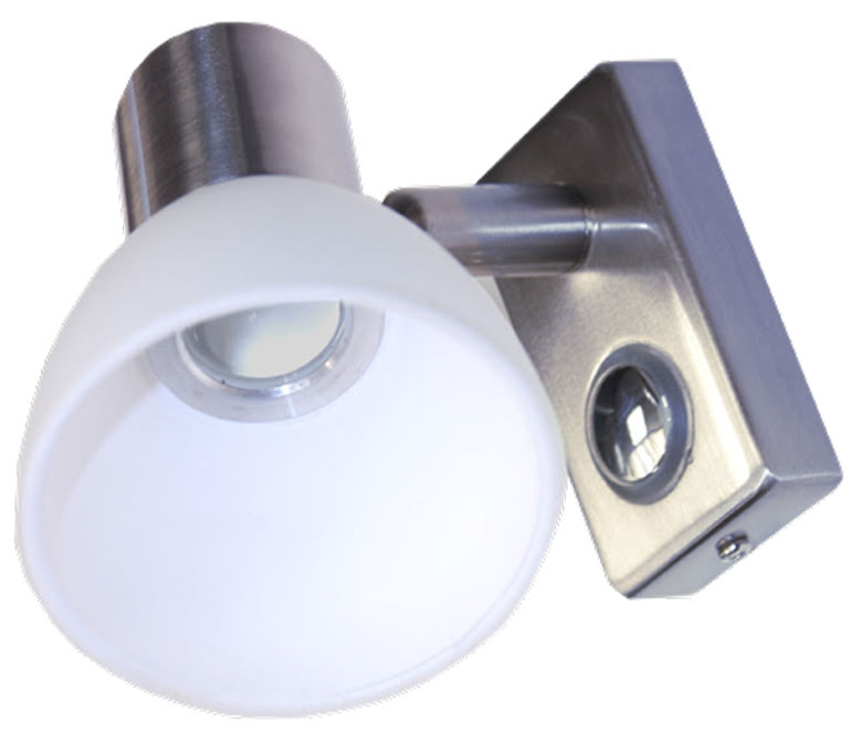 Leselampe aus gebürstetem Stahl und weißem Schirm für Wohnwagen oder Wohnmobil.
