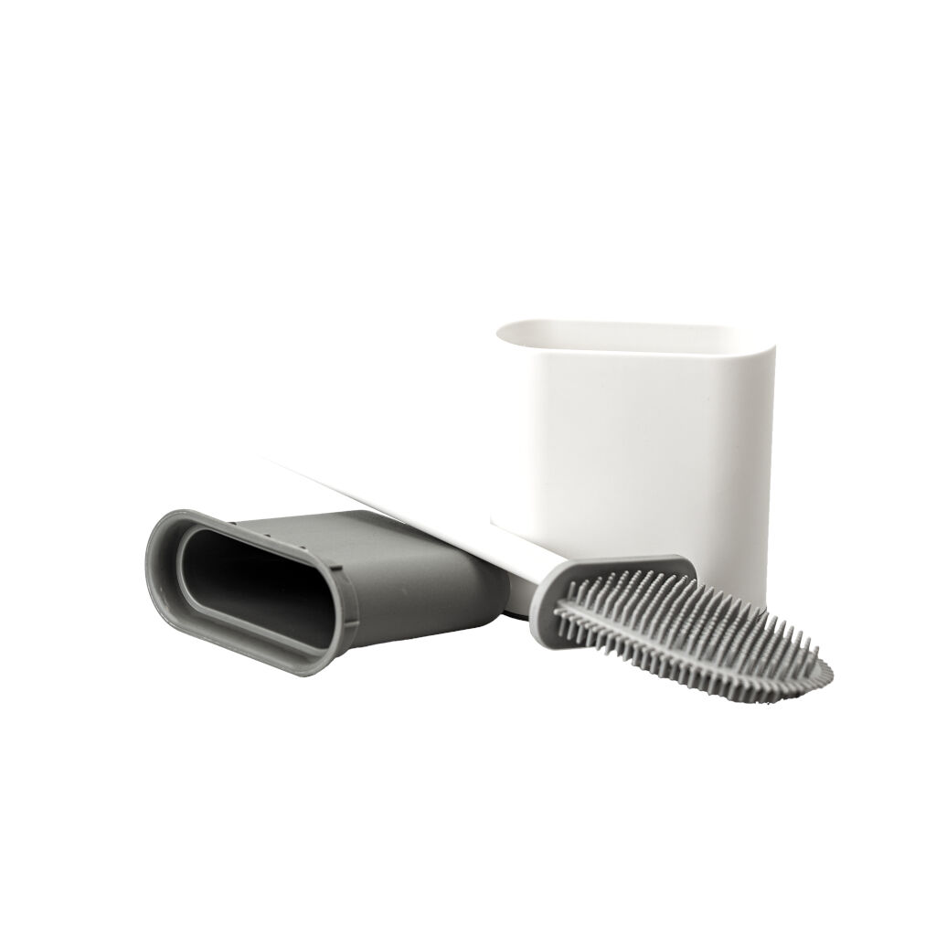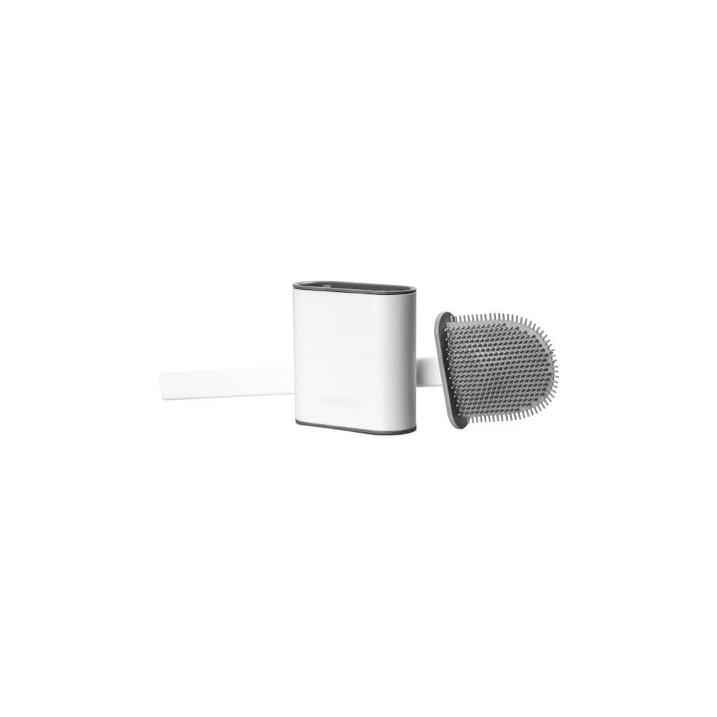 Schicke und gut gestaltete Toilettenbürste, die leicht in enge Toilettenräume passt. Der Behälter hat eine doppelte Schicht, um die Bürste trocken und einsatzbereit zu halten. Einfache Installation dank des mitgelieferten Montagebands.